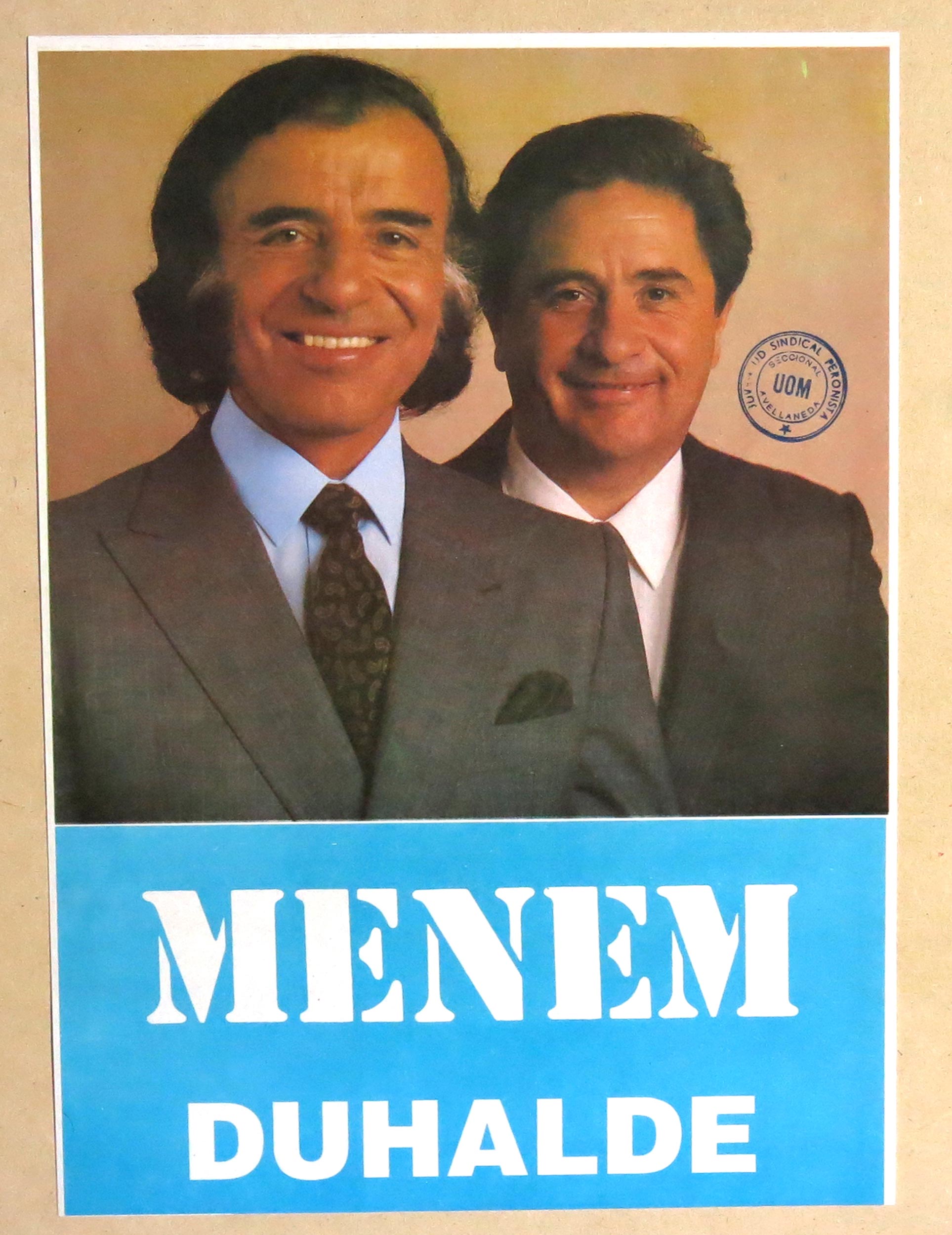 Foto de Menem y Duhalde. Solo se reproducen sus apellidos. Con sello de la UOM Avellaneda.