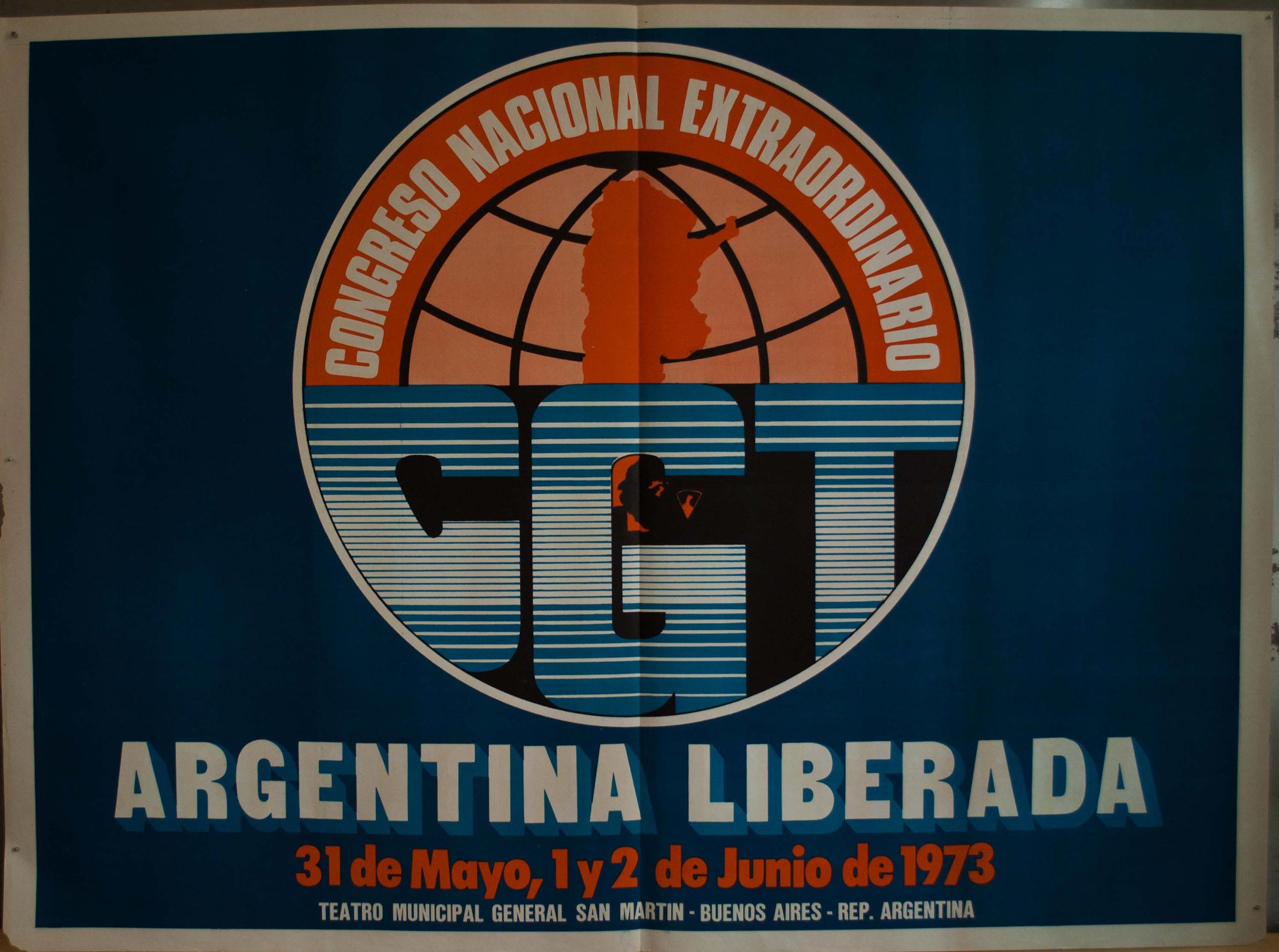 Afiche impreso en narajas, azules y blanco. Se lee: Congreso Nacional Extraordinarios-CGT. Argentina Liberada. 31 de mayo, 1 y 2 de junio de 1973. Teatro Municipal General San MartÃn- Buenos Aires - Rep. Argentina".