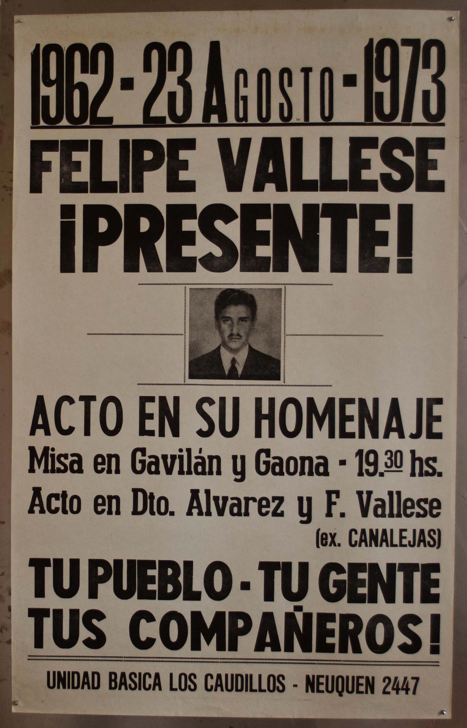 Afiche impreso en negro, se lee: "1962 - 23 Agosto - 1973. Felipe Vallese ¡Presente! Acto en su homenaje. Misa en Gavilán y Gaona - 19.30 hs. Acto en Dto. Álvarez y F. Vallese (ex. Canalejas) Tu pueblo- Tu gente, Tus compañeros".