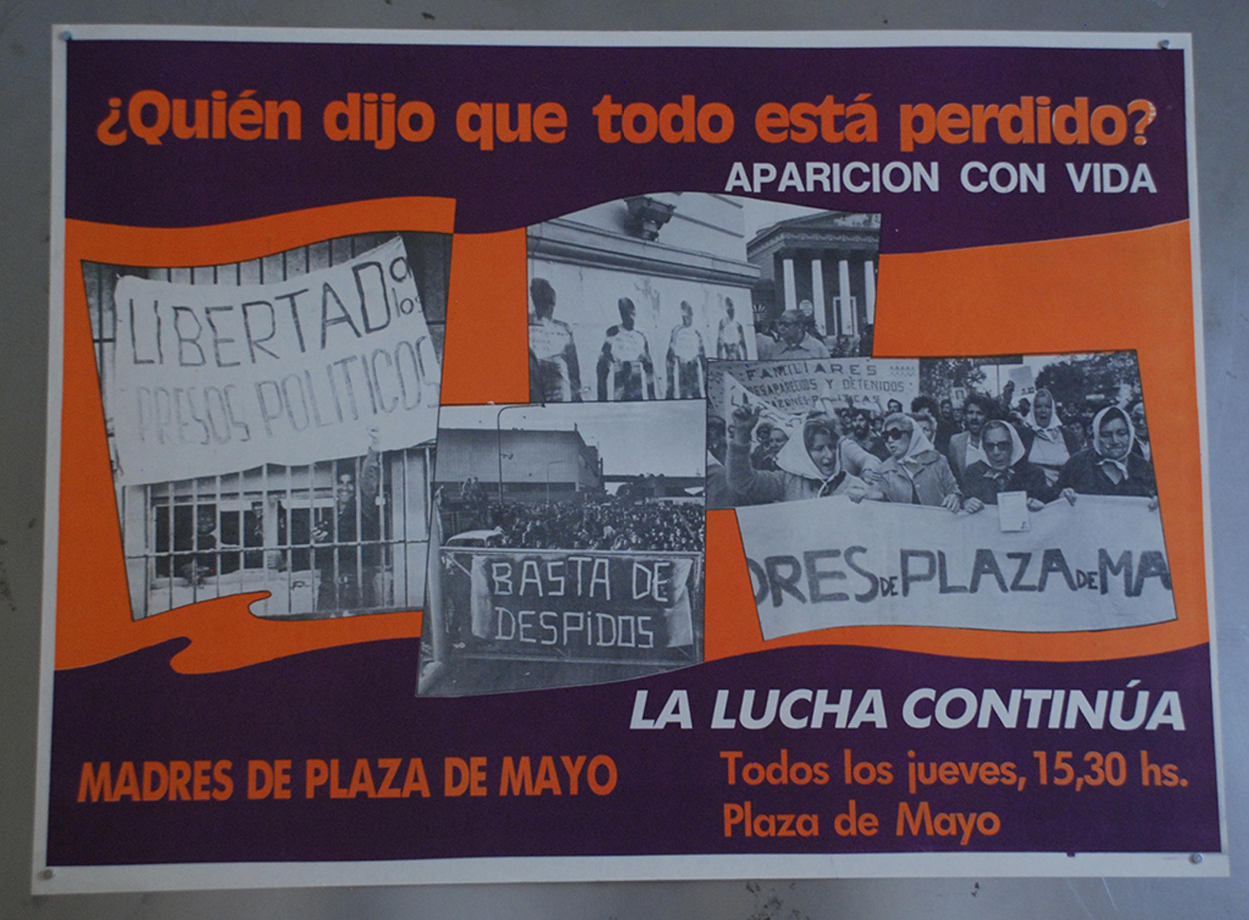 Afiche impreso en naranja y violeta. Se observan imágenes de protestas. Se lee: "¿Quién dijo que todo está perdido? La lucha continúa. Todos los jueves, 15:30 hs. Plaza de Mayo".