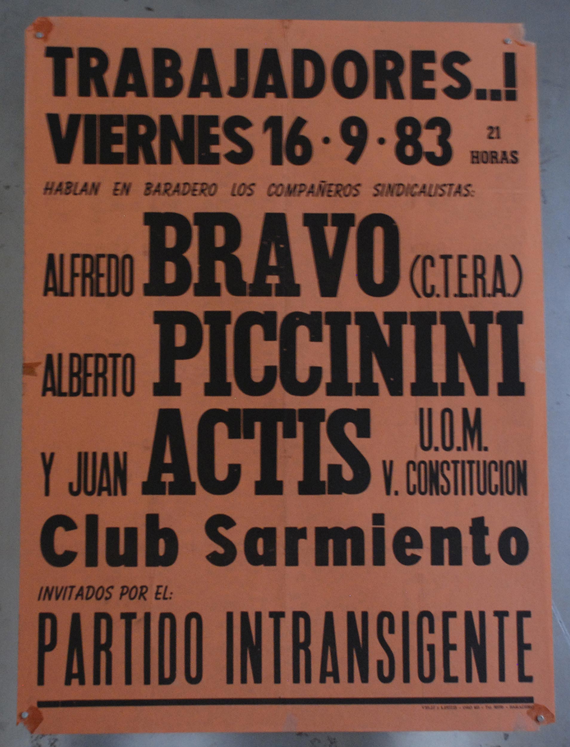 Afiche impreso en negro sobre fondo naranja. Se lee: "Trabajadores..! Viernes 16-9-83 21 horas hablan en Baradero los compañeros sindicalistas: Alfredo Bravo (CTERA), Alberto Piccinini y Juan Actis (OUM V. Constitución)".
