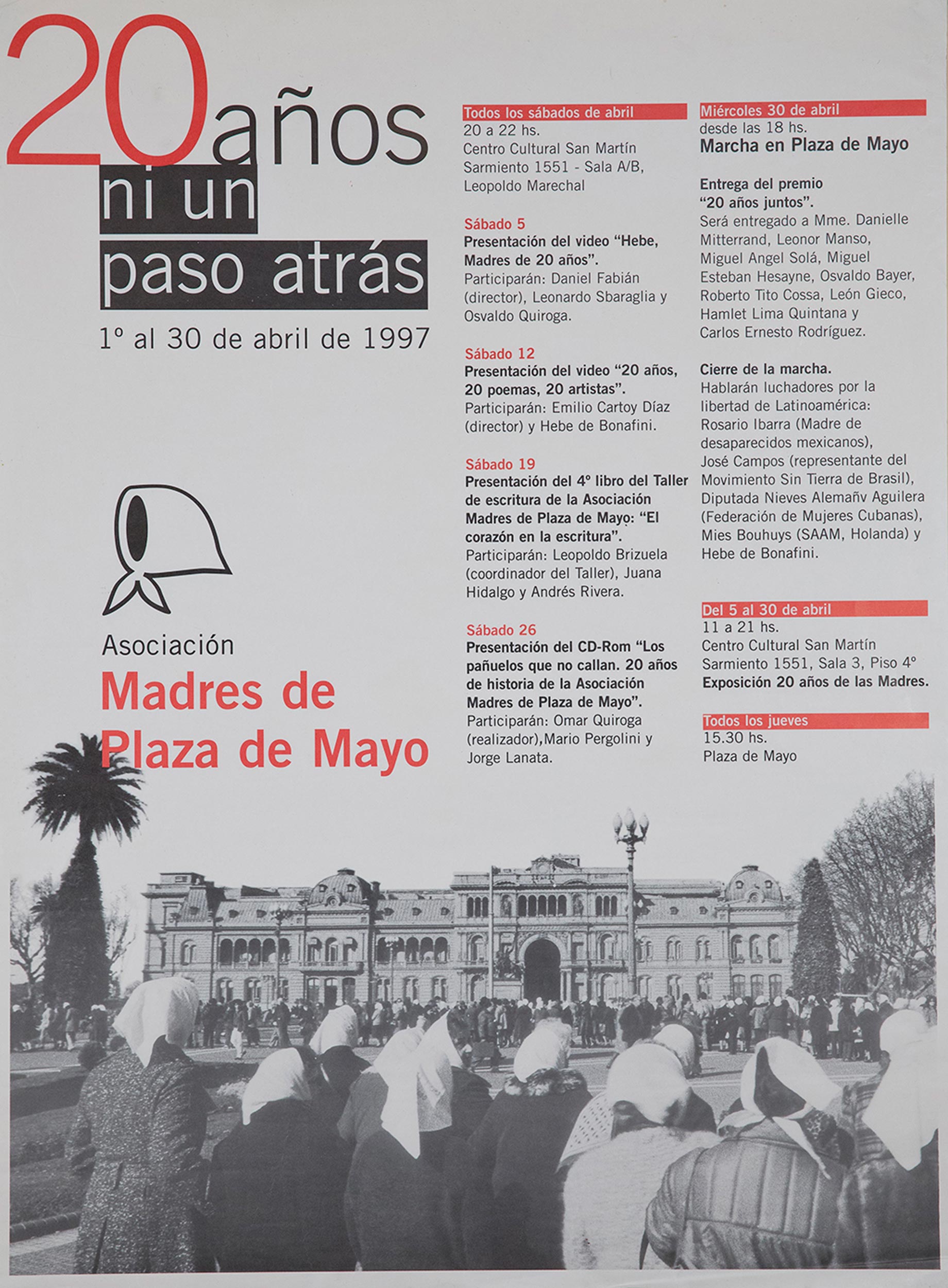 Afiche impreso en rojo, negro y grises. Imagen de ronda de Madres de Plaza de Mayo en Plaza de Mayo. Se detallan las actividades que se realizarán entre el 1° y el 30 de abril.
