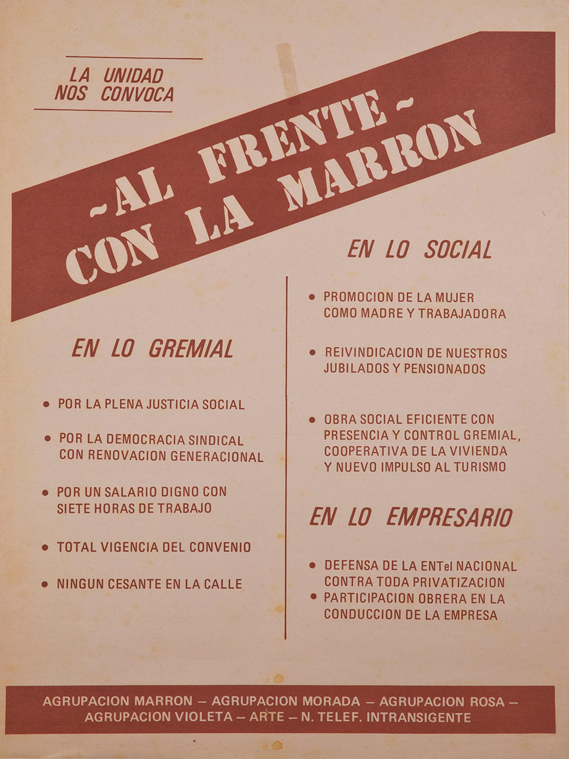 Afiche impreso en marrón sobre papel blanco. Se lee: "La unidad nos convoca. En lo gremial por la plena justicia social; por la democracia sindical con renovación generacional; por un salario digno con siete horas de trabajo (...) en lo social Promoción de la mujer como madre y trabajadora (...) en lo empresario defensa de ENTeL Nacional contra toda privatización; participación obrera en la conducción de la empresa".