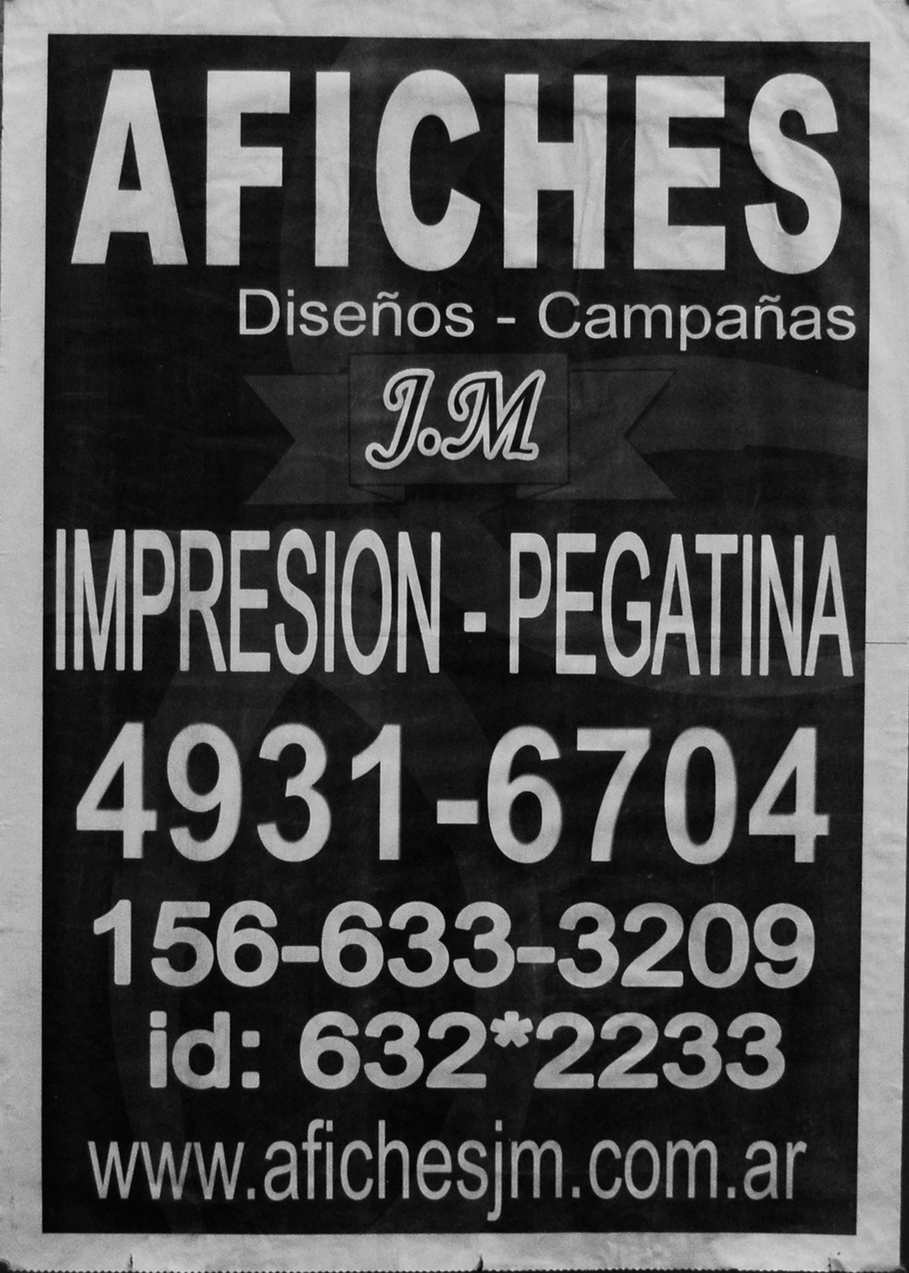Cartel de promoción para la impresión de afiches. Se lee: "Afiches Diseños- Campañas. J.M. Impresión-Pegatina (...) www.afichesjm.com.ar".