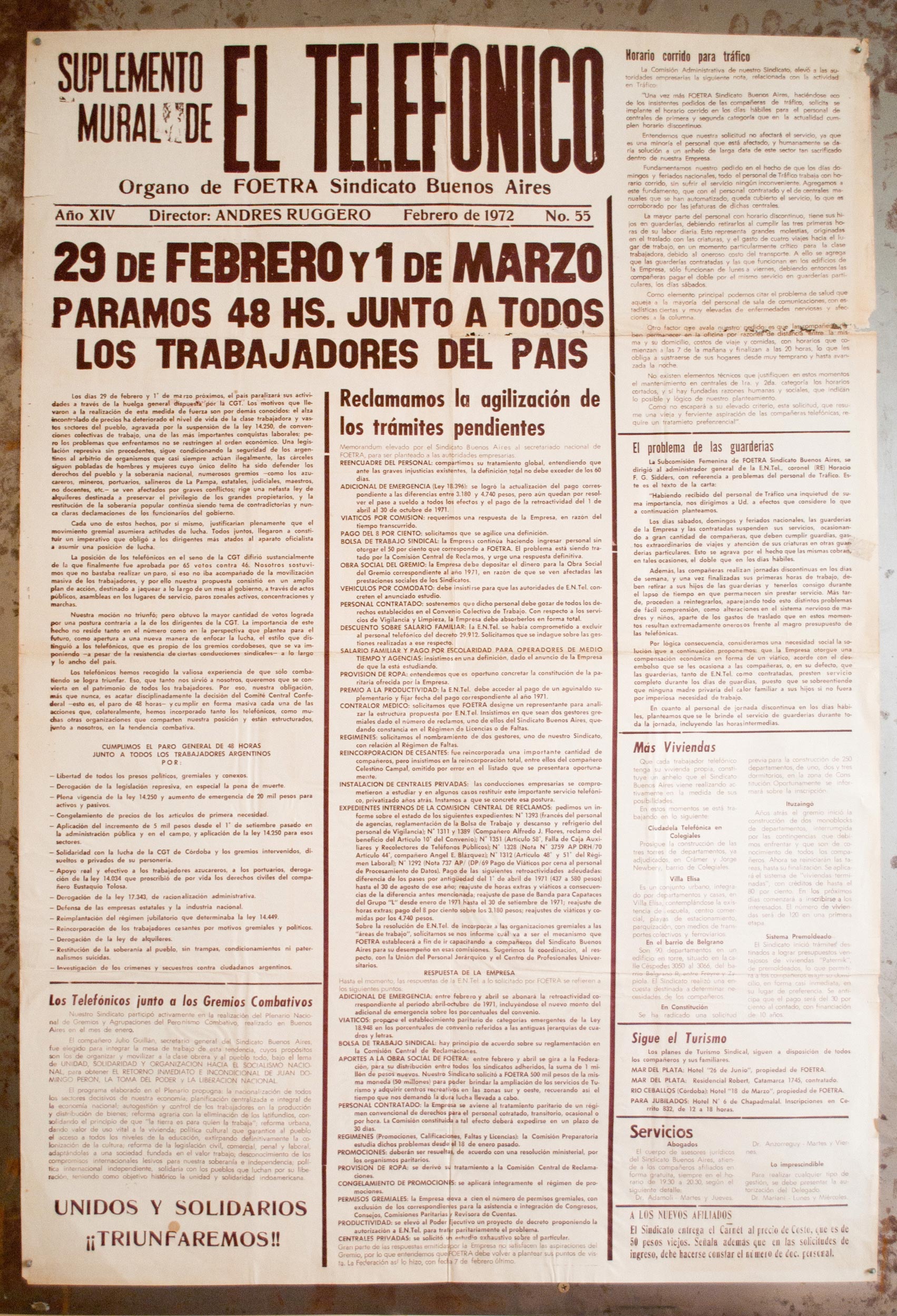 Impreso en marrón sobre fondo blanco. Se lee: "Suplemento mural de El Telefónico. Organo de FOETRA Sindicato de Buenos Aires. Año XIV. Director Andrés Ruggero Febrero de 1972, N° 55. 29 de Febrero y 1 de Marzo paramos 48 hs. junto a todos los trabajadores del país (...) Los telefónicos junto a los gremios combativos (...)".