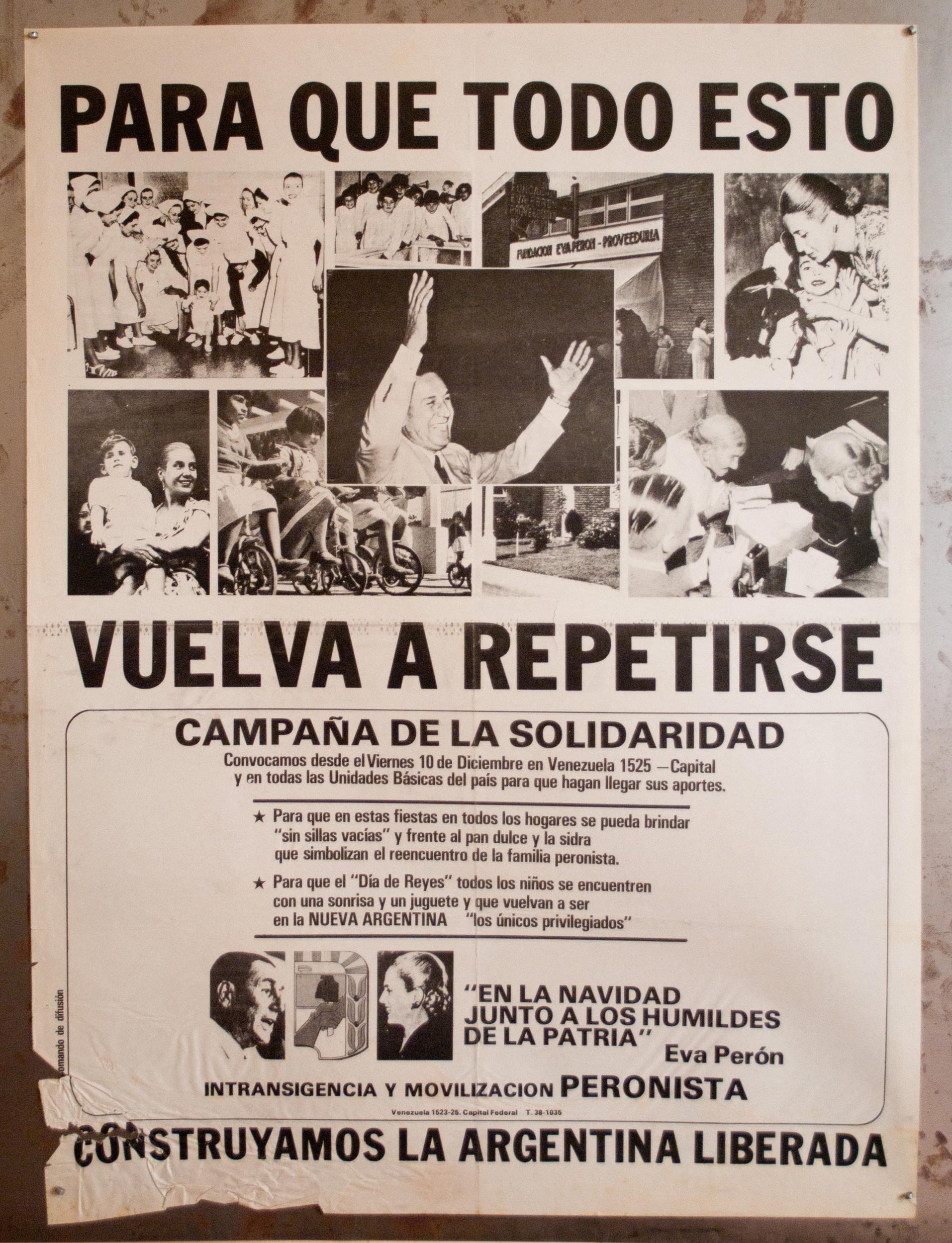 Afiche impreso en blanco y negro con imágenes de la acción social realizada por Perón y Evita entre 1945 y 1955. Se lee: "Para que todo esto vuelva a repetirse. Campaña de la Solidaridad. (...) Para que en estas fiestas en todos los hogares se pueda brindar 'sin sillas vacías' y frente al pan dulce y la sidra que simbolizan el reencuentro de la familia peronista. (...)".