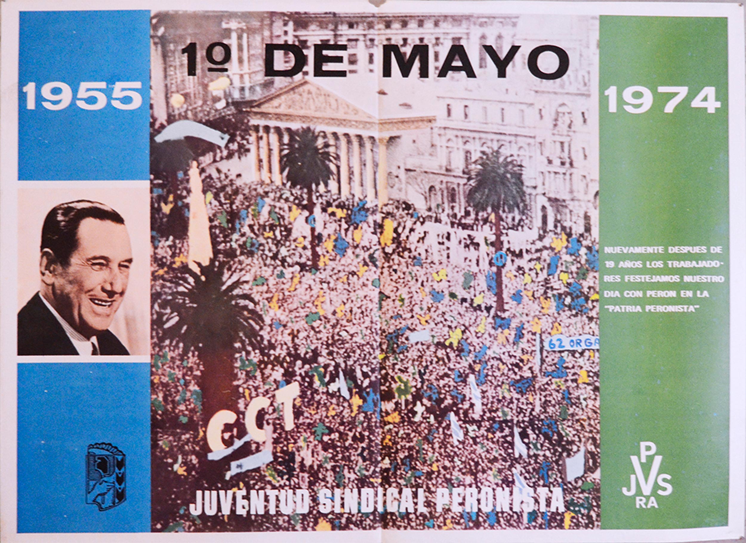 Afiche impreso a color, a la izquierda foto de J. D. Perón, en el centro imagen de una movilización en Plaza de Mayo (es una foto pero intervenida con colores arriba), a la derecha se lee: "Nuevamente después de 19 años los trabajadores festejamos nuestro día con Perón en la 'Patria Peronista'".