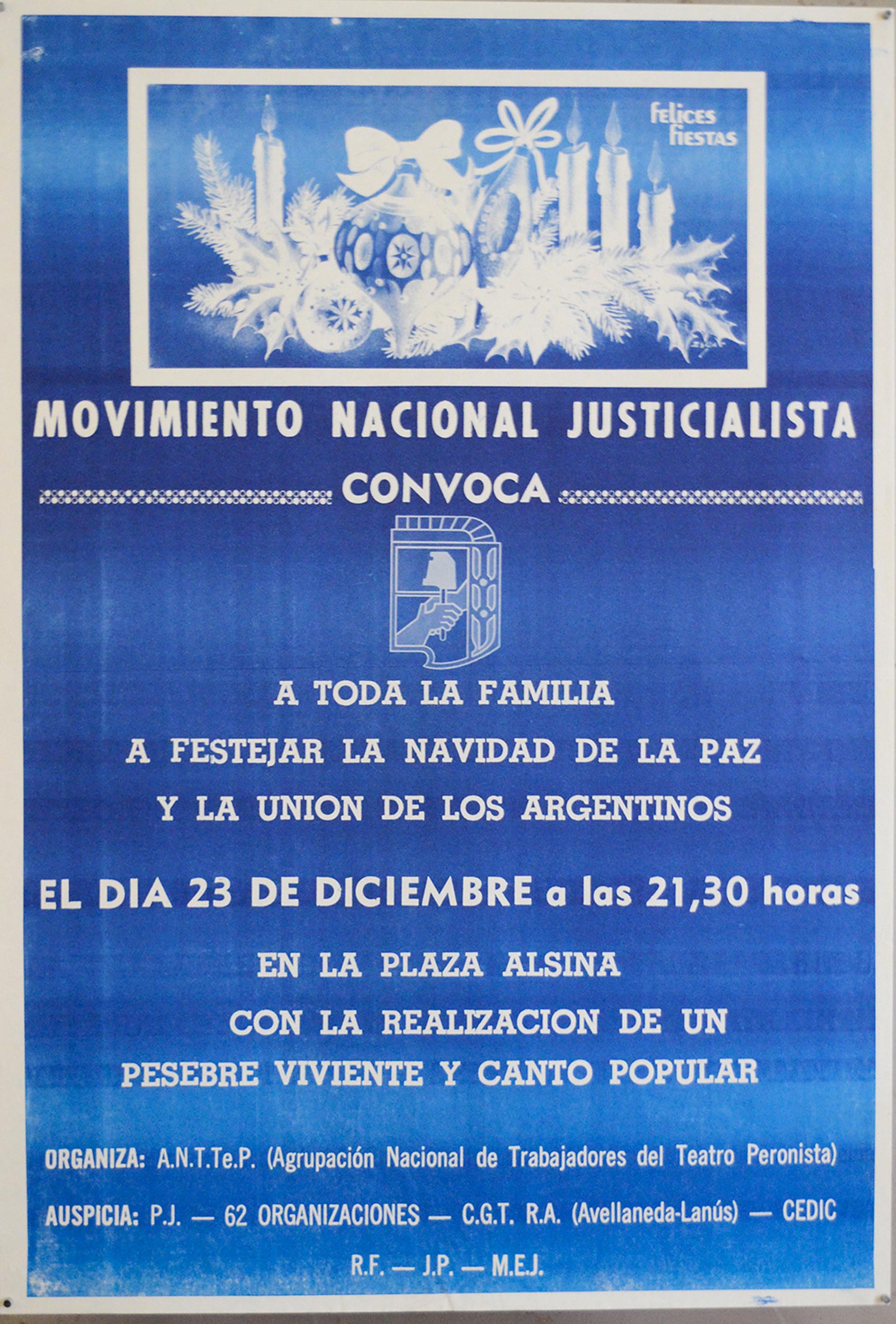 Afiche en azul y blanco. Arriba una imagen navideña se lee: "Felices fiestas". A continuación se convoca "a toda la familia a festejar la navidad de la paz y la unión de los argentinos. El día 23 de diciembre a las 21,30 horas en la Plaza Alsina con la realización de un pesebre viviente y canto popular. Organiza: A.N.T.Te.P. (Agrupación Nacional de Trabajadores del Teatro Peronista). Auspicia: P.J.- 62 Organizaciones- C.G.T. R.A. (Avellaneda-Lanús)- CEDIC R.F.- J.P.- M.E.J.".