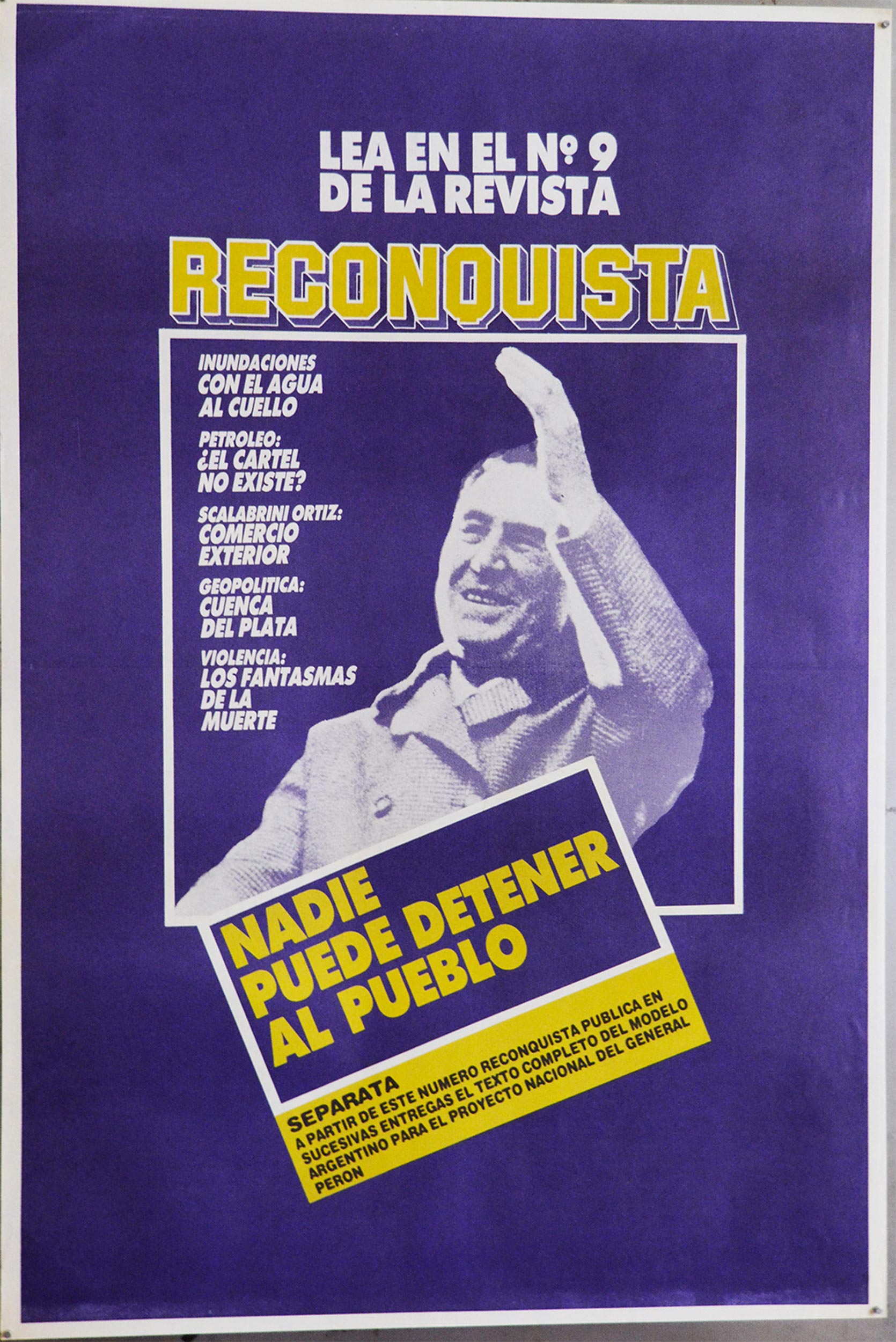 Afiche de fondo violeta, en el centro una imagen de Juan Domingo Perón en grises. Se lee: "Lea el N° 9 de la Revista Reconquista. 'Inundaciones con el agua al cuello. Petróleo: ¿El cartel no existe?. Scalabrini Ortíz: Comercio Exterior. Geopolítica: Cuenca del Plata. Violencia: los fantasmas de la muerte. Nadie puede detener al pueblo. Separata. A partir de este número reconquista publica en sucesivas entregas el texto completo del modelo argentino para el proyecto nacional del General Perón".