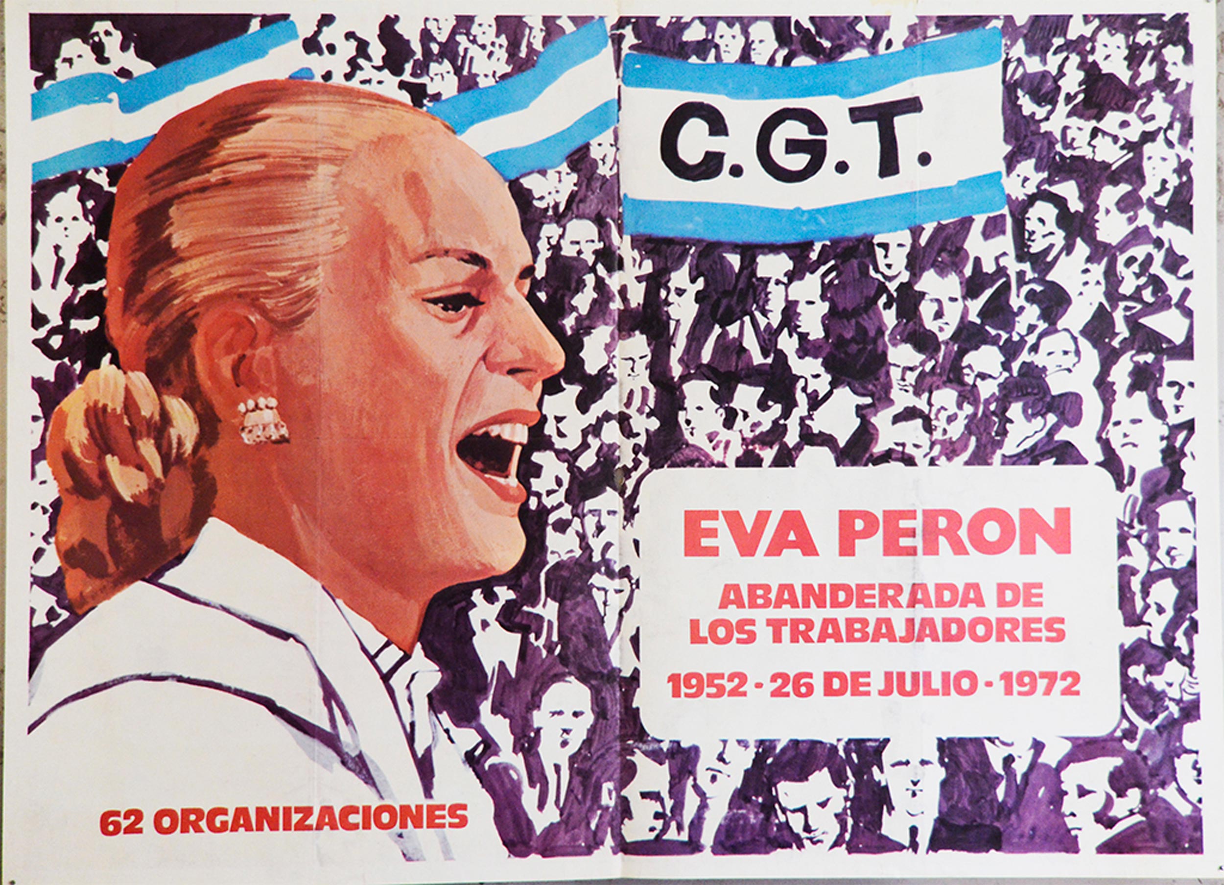 Impreso a color, a la izquierda dibujo del rostro de Evita y de fondo movilización. Se lee: "Eva Perón abanderada de los trabajadores. 1952-26 de julio.1972".