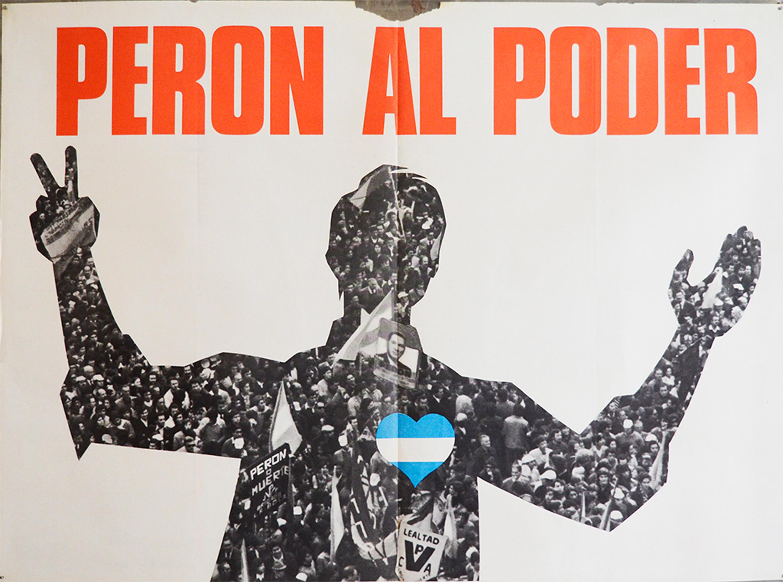 Impreso en rojo y grises sobre fondo blanco. En el centro del afiche se recorta una figura con los brazos en alto con imágenes de movilizaciones al interior y un corazón en celeste y blanco en el lugar del pecho. Arriba se lee: "Perón al poder".