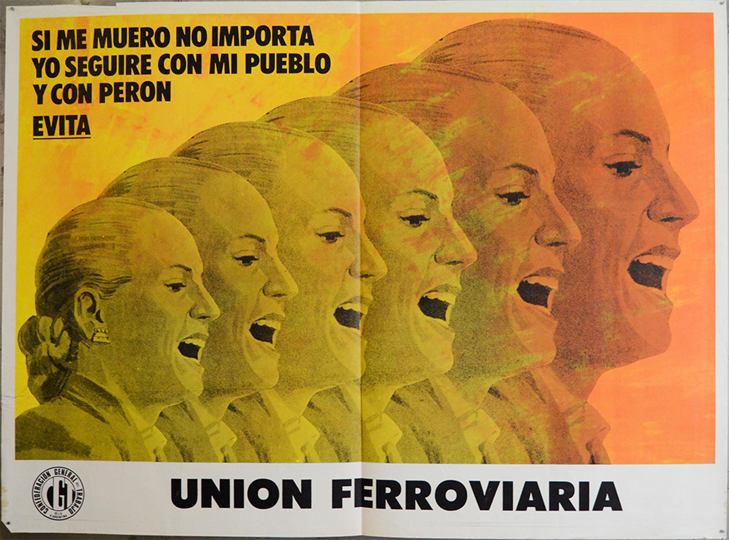 Impreso en amarillos y naranjas, con rostro de Eva Perón de perfil, que se repite. Se lee: "Si me muero no importa yo seguiré con mi pueblo y con Perón. Evita".