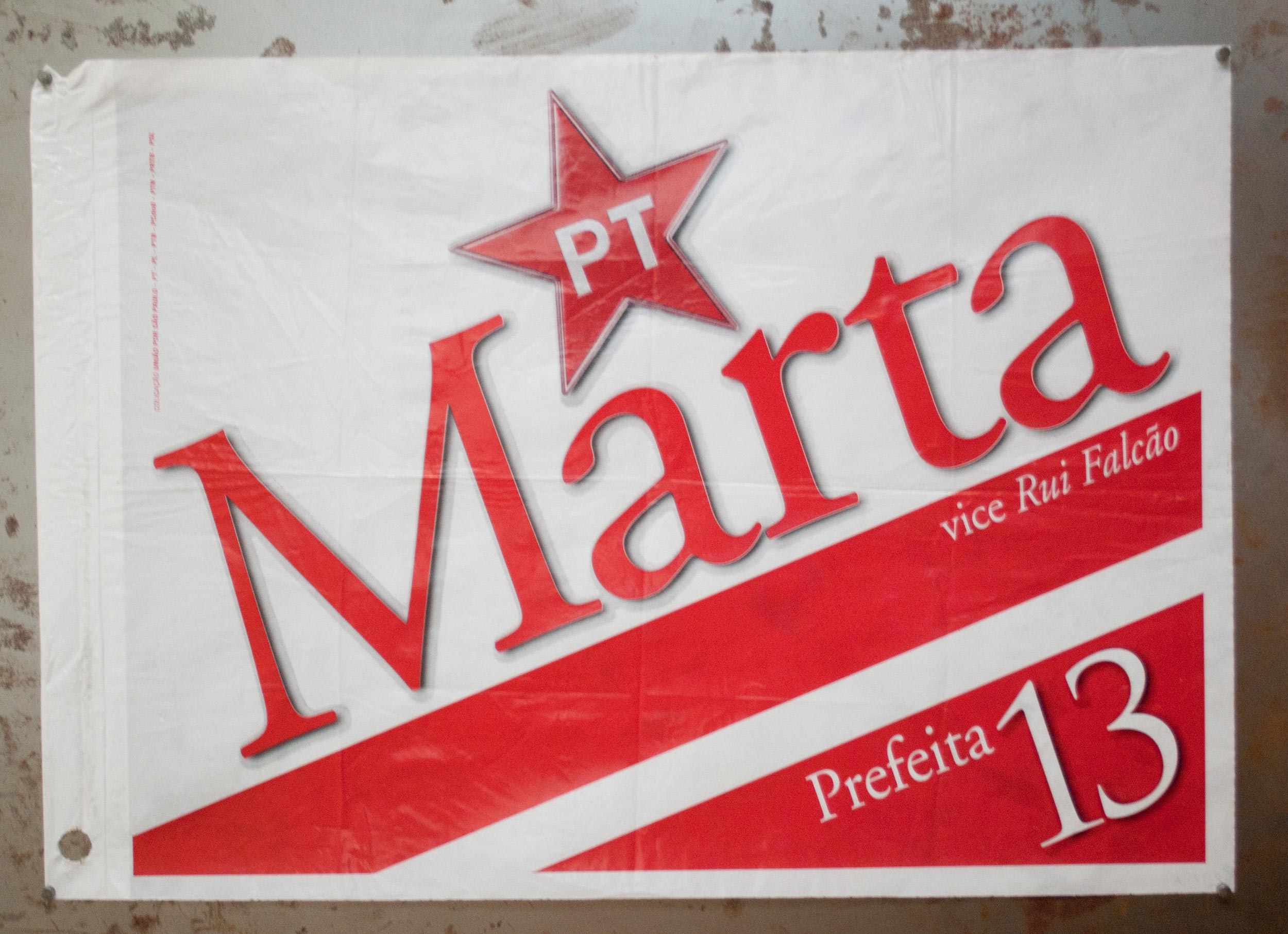 Impreso en rojo sobre fondo blanco. Se lee: "PT Marta [Supicichi?]. vice Rui Falcao. Prefeita 13".