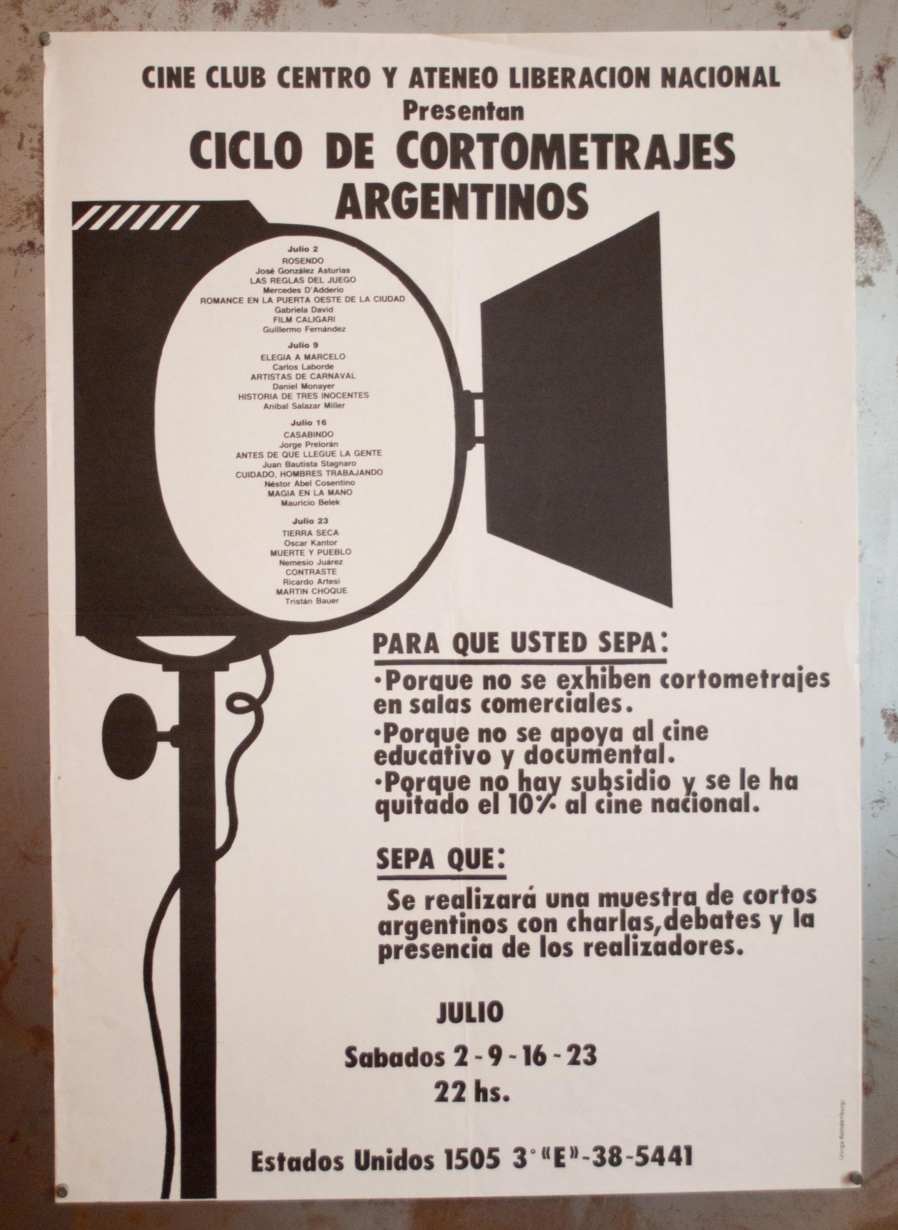 Impreso en negro sobre fondo blanco. Se lee: "Cine club centro y Ateneo Liberación Nacional Presentan ciclo de Cortometrajes argentinos. (...) Para que usted sepa: porque no se exhiben cortometrajes en salas comerciales. Porque no se apoya el cine educativo y documental. Porque no hay subsidio y se le ha quitado el 10% al cine nacional. Sepa que: Se realizará una muestra de cortos argentinos con charlas, debates y la presencia de los realizadores". Y se detalla la lista de cortos que se van a pasar.