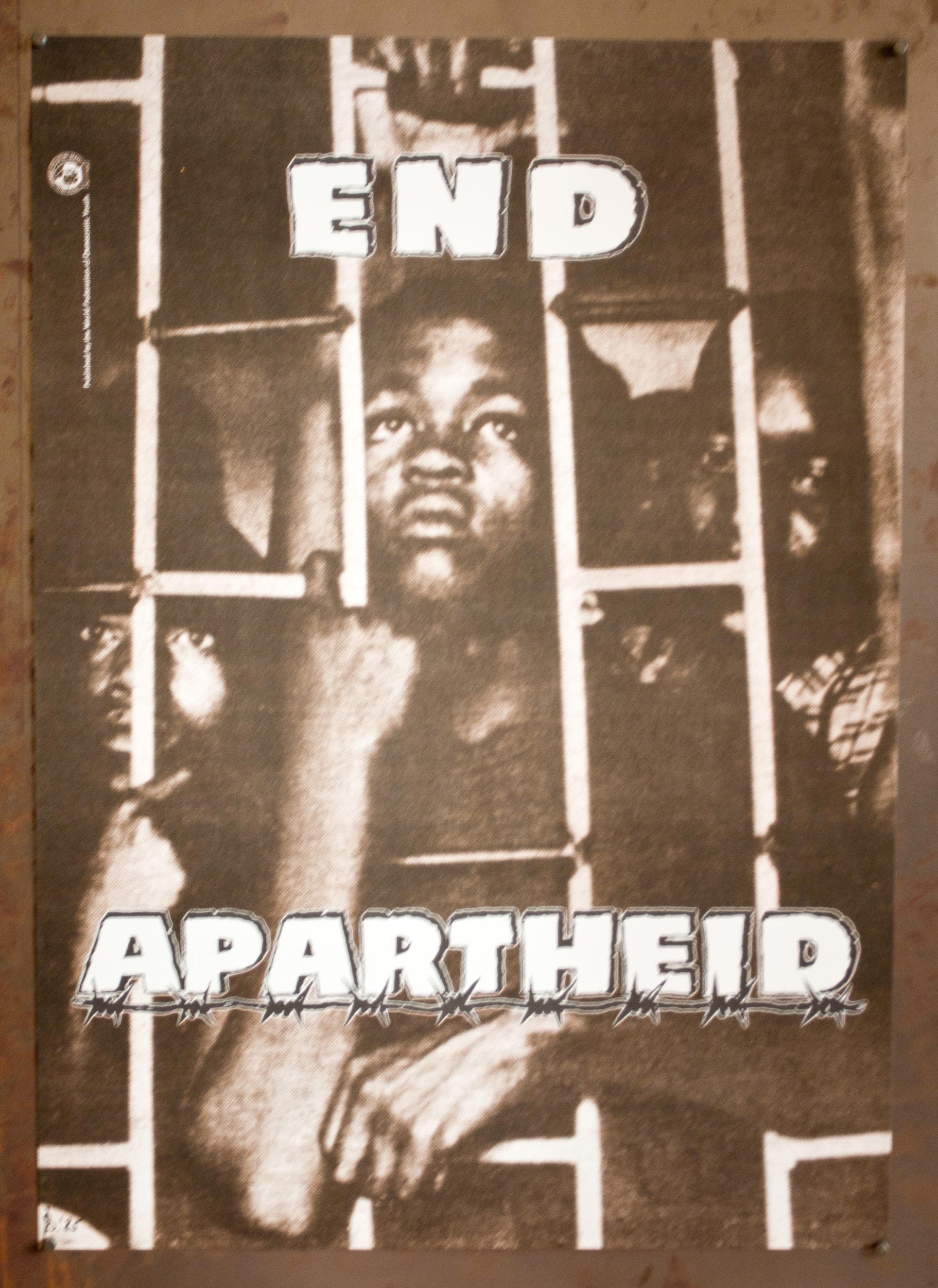 Impreso en blanco y negro se lee "End partheid" sobre una imagen de varias personas tras las rejas.
