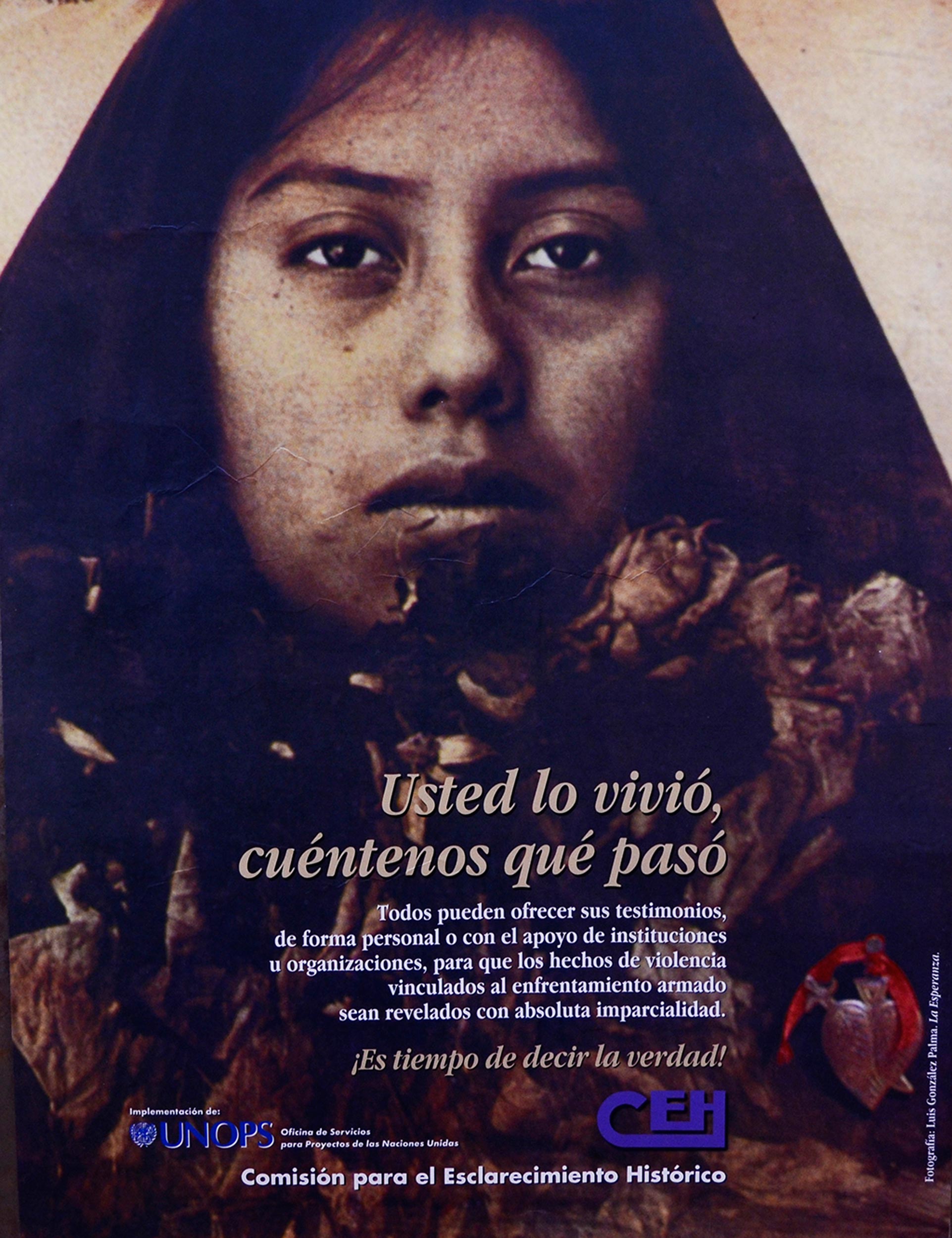 Afiche impreso a color con fotografía tomada por Luis González Palma, titulada "La Esperanza". Se lee: "Usted lo vivió, cuéntenos qué pasó. Todos pueden ofrecer sus testimonios, de forma personal o con el apoyo de instituciones u organizaciones, para que los hechos de violencia vinculados al enfrentamiento armado sean revelados con absoluta imparcialidad. ¡Es tiempo de decir la Verdad!".