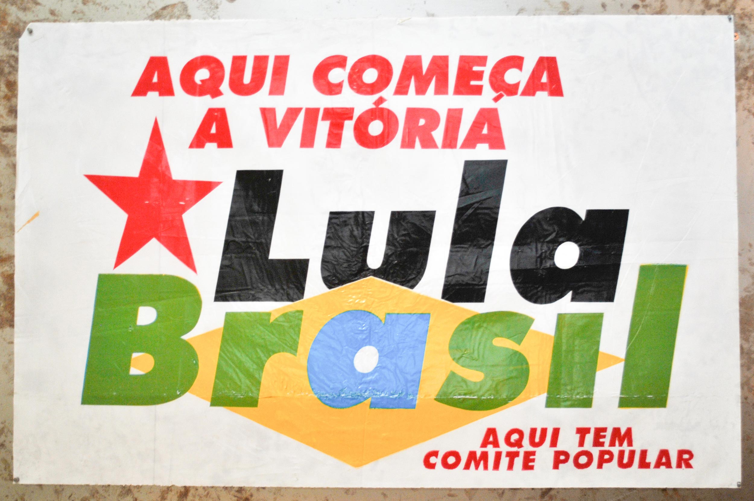 Afiche impreso a color. Se lee: "Aqui comenca a vitória. Lula Brasil. Aqui tem Comité Popular".