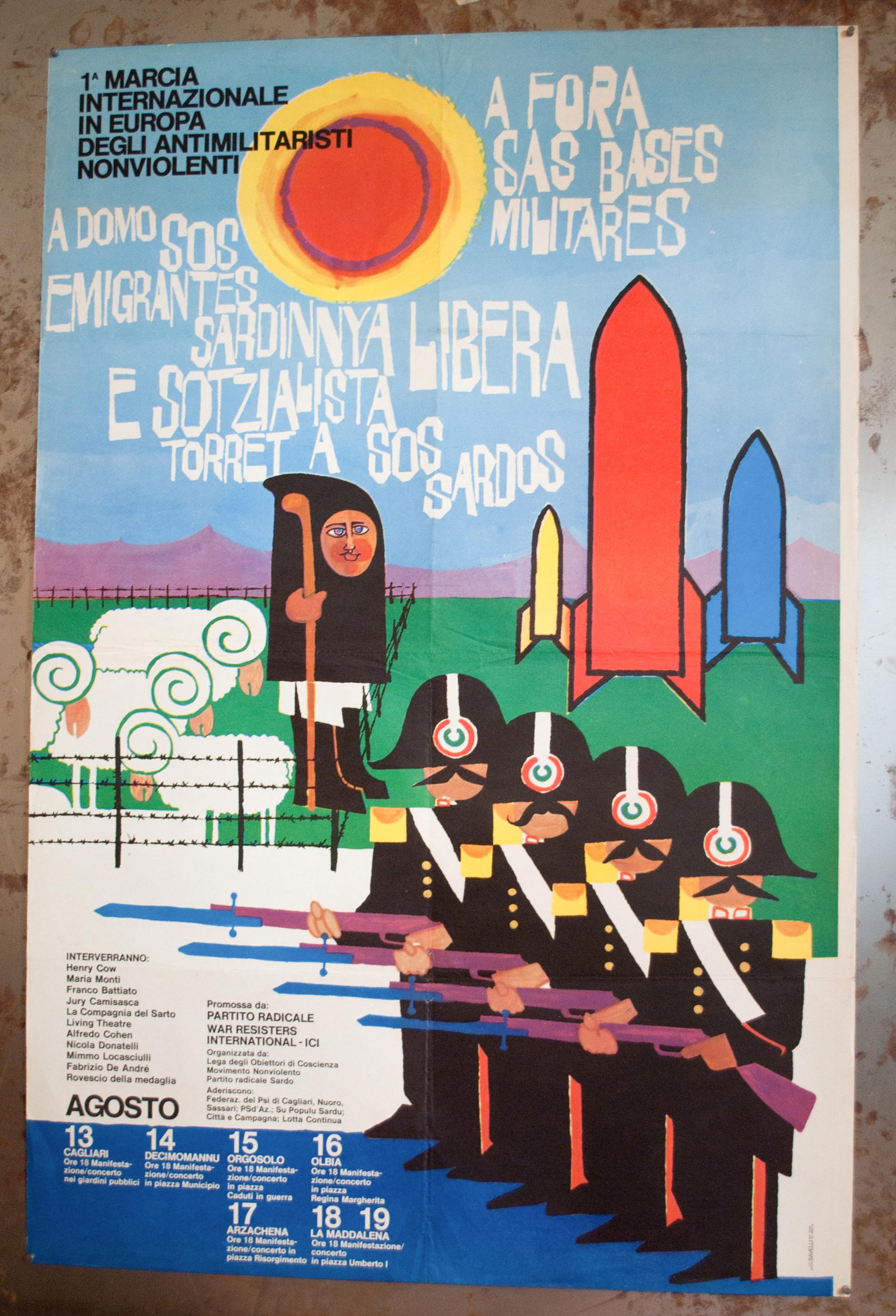Afiche impreso a color con dibujo compuesto por varias escenas: un hombre que cuida a unas ovejas cuyo cercado está realizado con alambre de púa, unas bombas y unos hombres del ejército. Se lee: "A fora sas Bases militares. A domo sos emigrantes sardinnya libera e sotzialista torret a sos sardos".