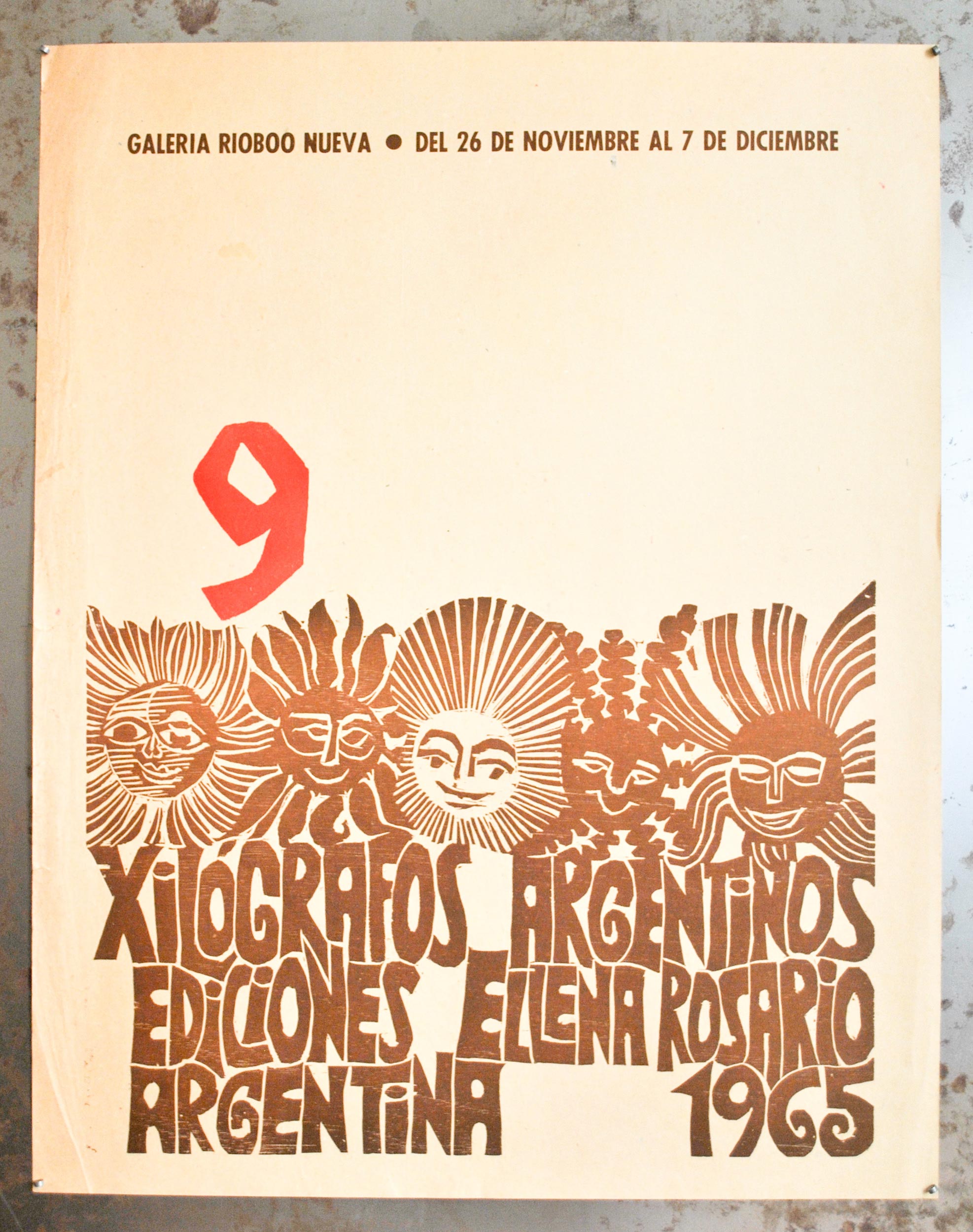Impreso en marrón y rojo, con estilo de xilografía. En el centro dibujos de unos soles. Arriba se lee: "Galeria Rioboo Nueva. Del 26 de noviembre al 7 de diciembre. 9". Y abajo (como parte de la imagen) dice: "Xilógrafos argentinos. Ediciones Ellena Rosario. Argentina 1965".