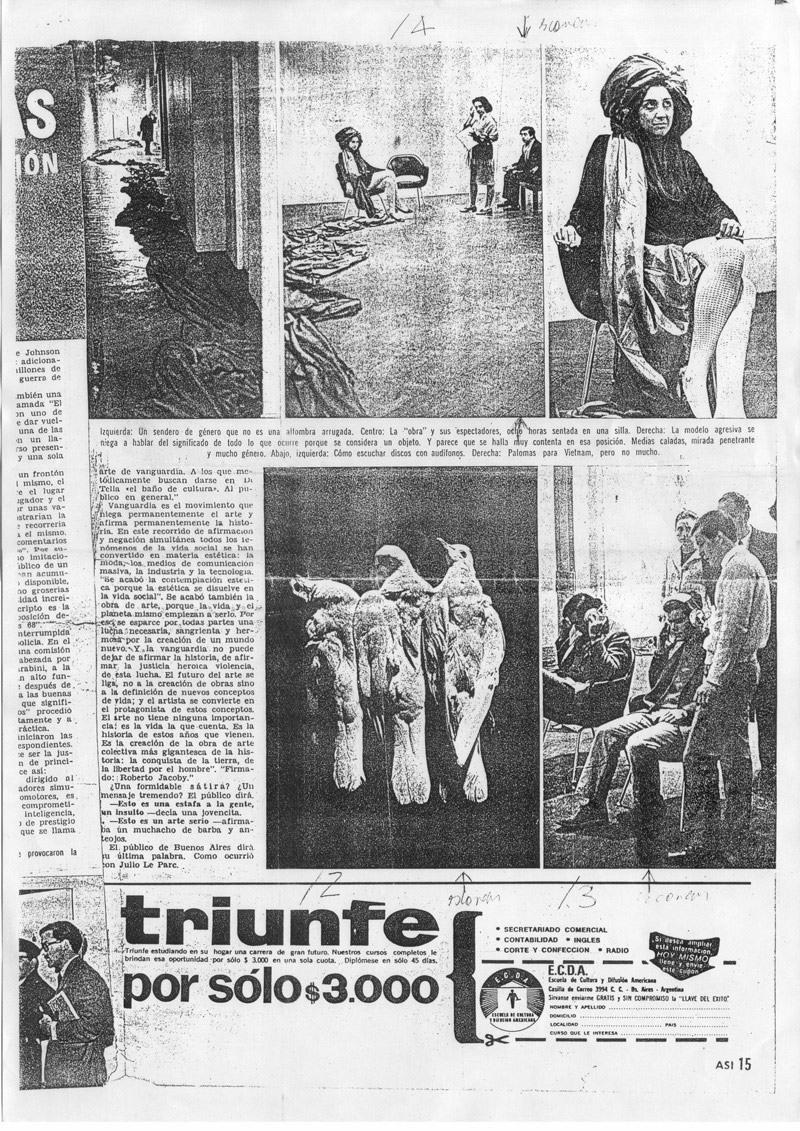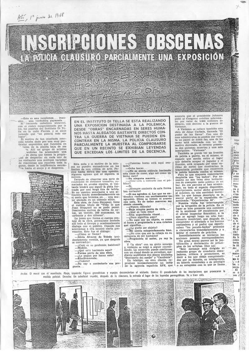 Artículo publicado en la revista Así del 1ro de junio de 1968 sobre "Experiencias 68" y la censura de la obra de Roberto Plate . La obra consistía en una instalación que simulaba un baño público en el cual "los actos placenteros de descarga físicos sean remplazados por actos de descarga emocional" (descripción del artista). La policía clausuró la obra al comprobar que en su interior se exhibían inscripciones y grafitis que consideraban obsenos y críticas al régimen militar.