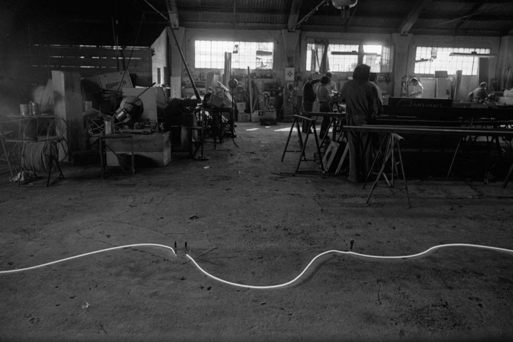 Registro de la fábrica. En primer plano, la cuerda de neón utilizada en la performance