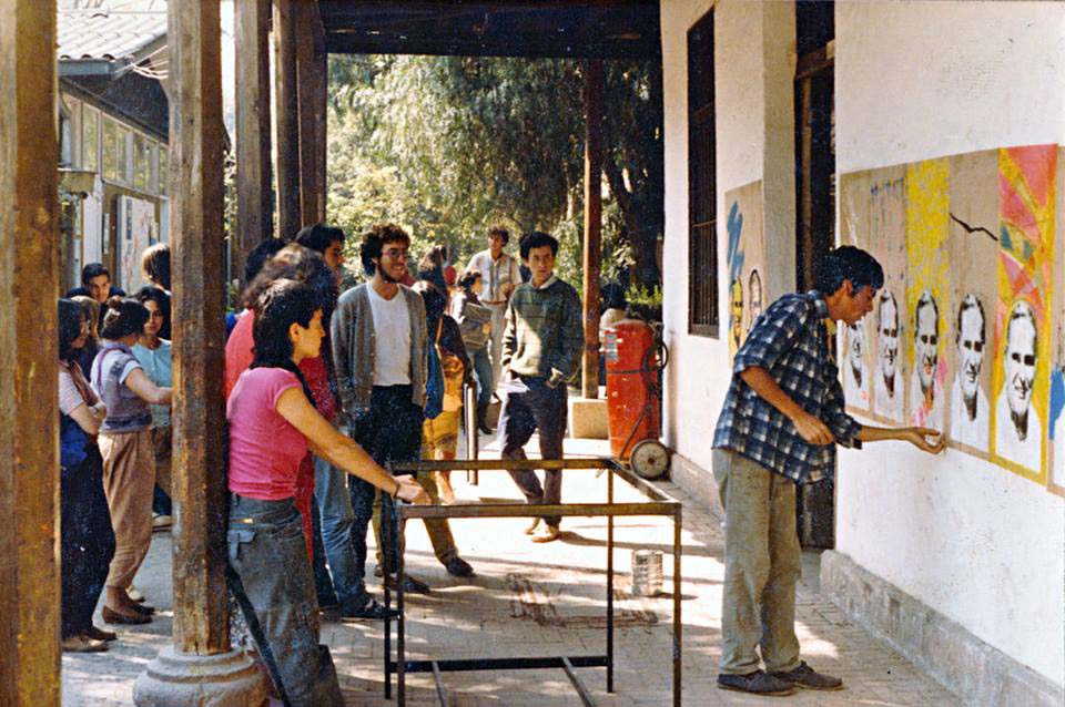 Luego de la acción realizada en la galería Bucci, otro de los lugares de replica fue en el Campus Lo Contador (Arquitectura y Diseño) de la Universidad Católica donde estudiaban algunos integrantes de la APJ. En la fotografía, las integrantes de la APJ continúan pegando las serigrafías frente a estudiantes de la Universidad.