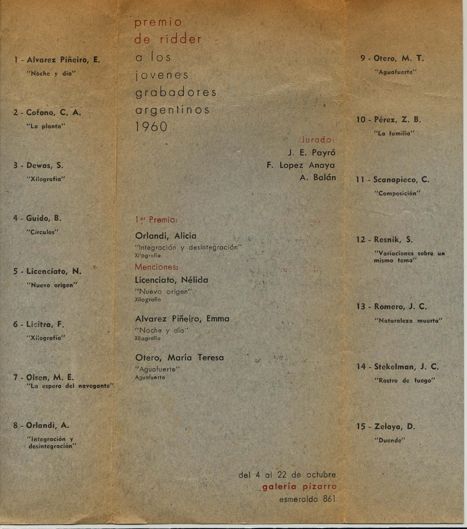 Participación con la obra "Naturaleza muerta". Aguatinta y aguafuerte. Participan, entre otros: Berjman, Carretero, Cichetfi, Cofone, Demichelli, Deputat, Fernandewz, Gersbach, Gianni, Madgrana, Mazliah, Prioti, Santamaría, Scheneideer, Vegas, Vinci, Álvarez Piñeiro, Cofono, Dewas, Guido, Licenciato, Licitro, Olson, Orlandi, Otero, Pérez, Scanapieco, Resnik, Romero, Stelekman, Zelaya.