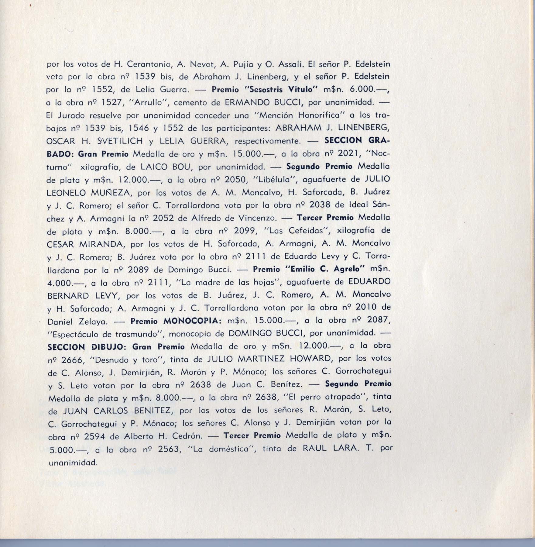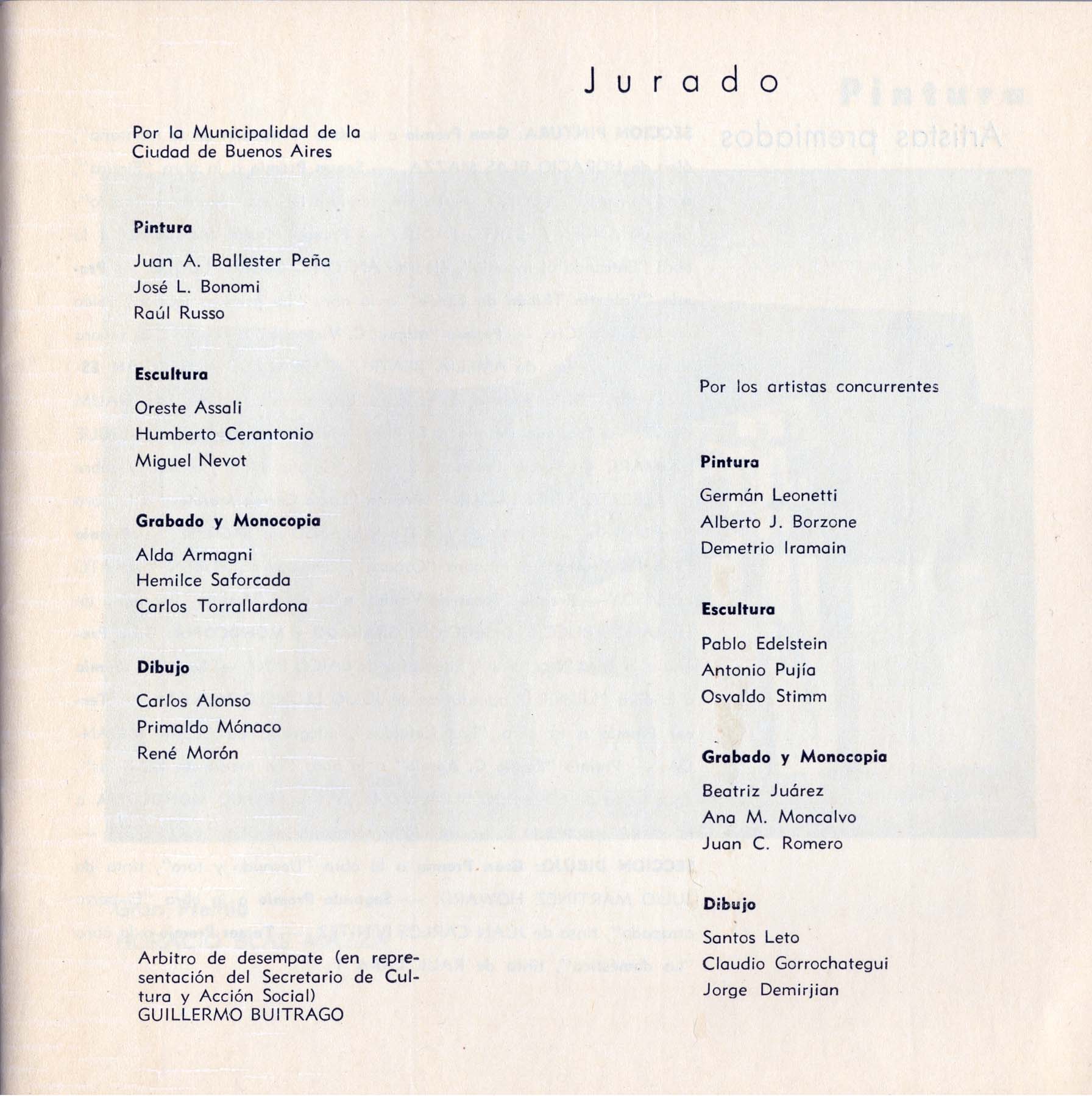 Jurado de grabado y monocopia "Por los artistas concurrentes". Participan, entre otros: Aime, Alvarez, Arcidiacono, Assali, Badaraco, barragan, Bertolotto, Bleuzet, Bonet, Bonome, Borzone, Botto, Bruveirs, Campanelli, Cañas, Casal, Cosenza, Chab, Chiavetti, Chiessa, Daltoe, Davilla, De la Fuente, Delmonte, De luca, Duran, Fadul, Faggioli, Fara, Ferrarotti, Fiorovanti, Fittipaldi, Fornieles, Fortunato, Galante, Garaviglia, Lopez, Mazza, Melo, Molinari, Monaco, Otero, pedemonte, Pereyra, Persico, Poggi, Quintana, Sturba, Segui, Roig, Vuono, Acal, Adaime, ALbertazzi, Alonso, Altieri, De la Mota, Diamante, Licitra, Locaso, Tosello, Vanz, Armagni, Borzone, Bou, Drago, Levy, Martinez, Porter, Paley, Sica, Santander, Scannapico, Sanchez, Rolon, Roig, Perez, Negri.