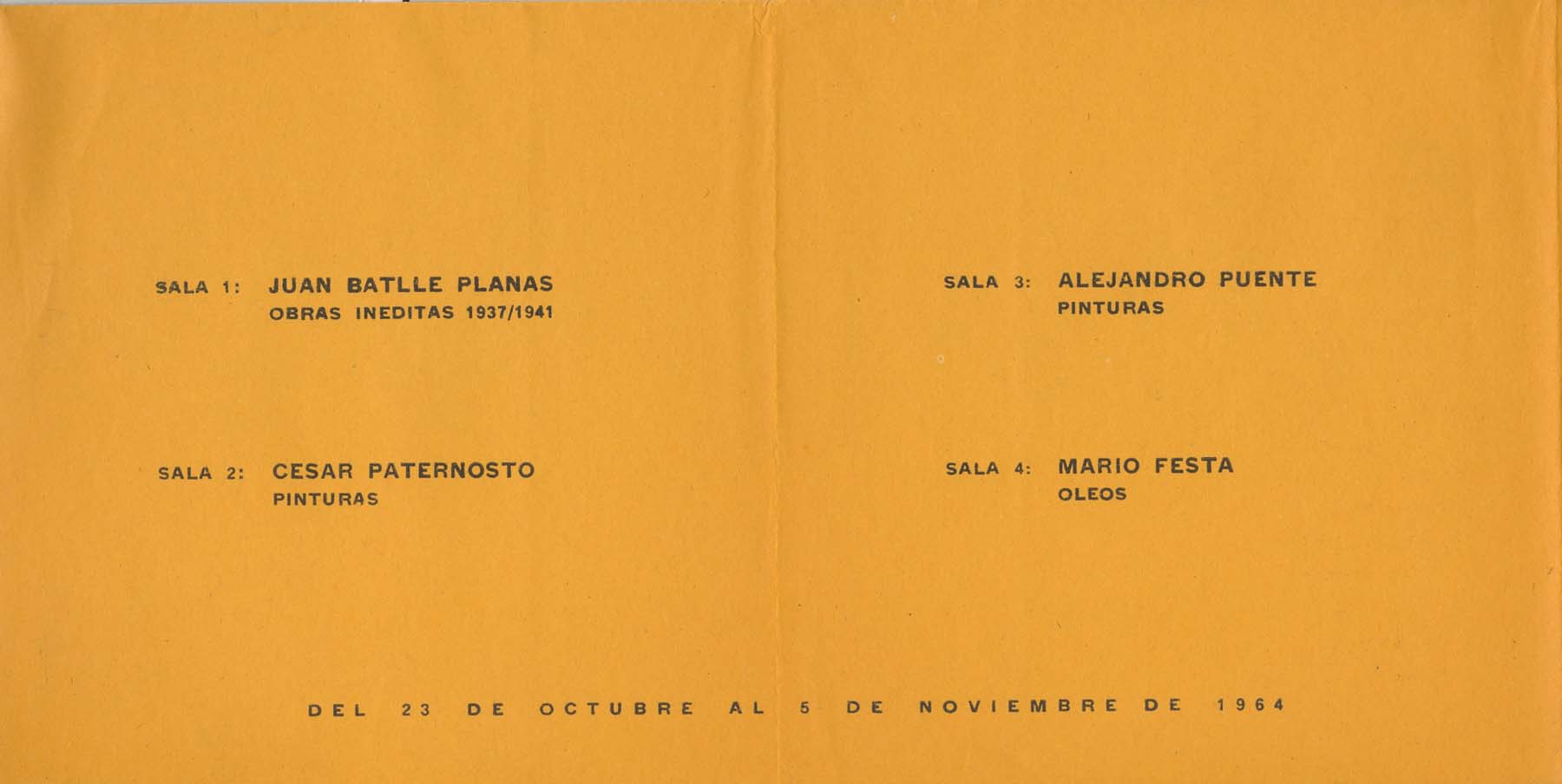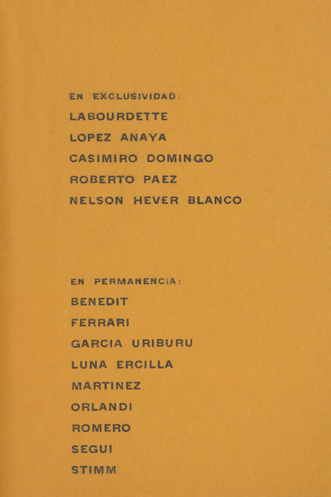 Invitación a visitar la galería. Exhiben: Juan Batlle Planas, César Pasternosto, Alejandro Puente, Mario Festa, Labourdete, Lopez Anaya, Casimiro Domingo, Roberto Paez, Nelson Hever Blanco, Benedit, Ferrari, García Uriburu, Luna Ercilla, Martínez, Orlandi, Romero, Segui, Stimm,