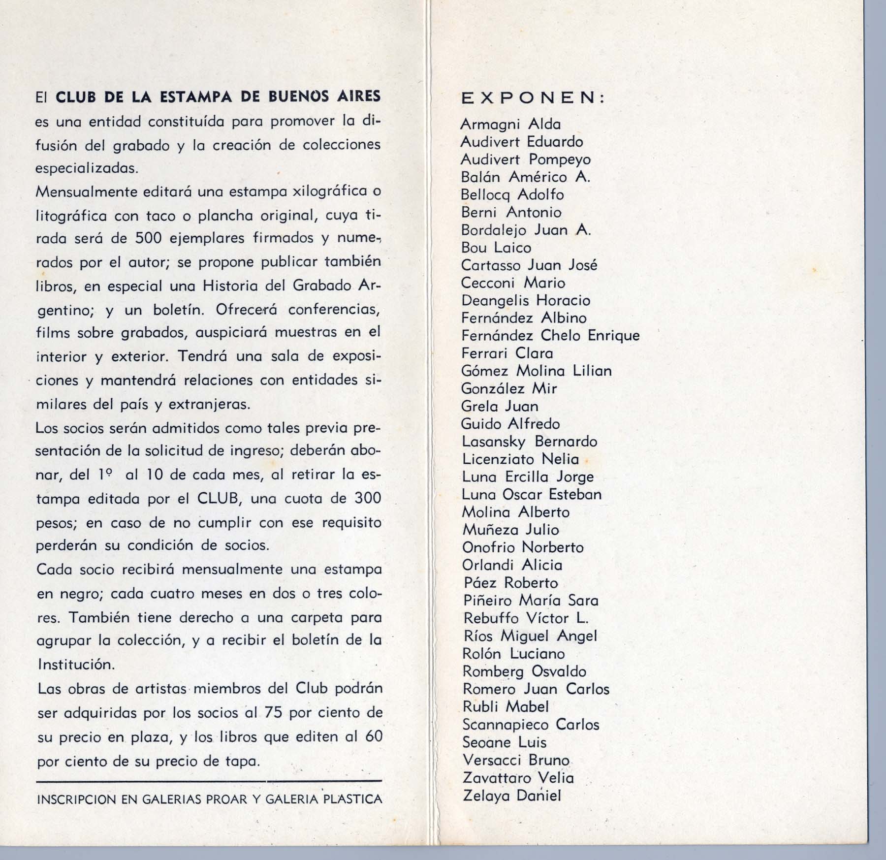 Exposición junto a otros/as miembros Club de la Estampa. Exponen, entre otros: Armagni, Audivert, Balán, Bellocq, Berni, Bordalejo, Cecconi, Fernandez, Ferrari Clara, González Mir, Grela, Luna Ercilla, Molina, Muñeza, Orlandi, onofrio, Páez, Piñeiro, Rebuffo, Ríos, Rolón, Romero, Rubli, Scannapieco, Seoane, Versacci, Zovattoro, Zelaya. Texto del Club de la estampa.