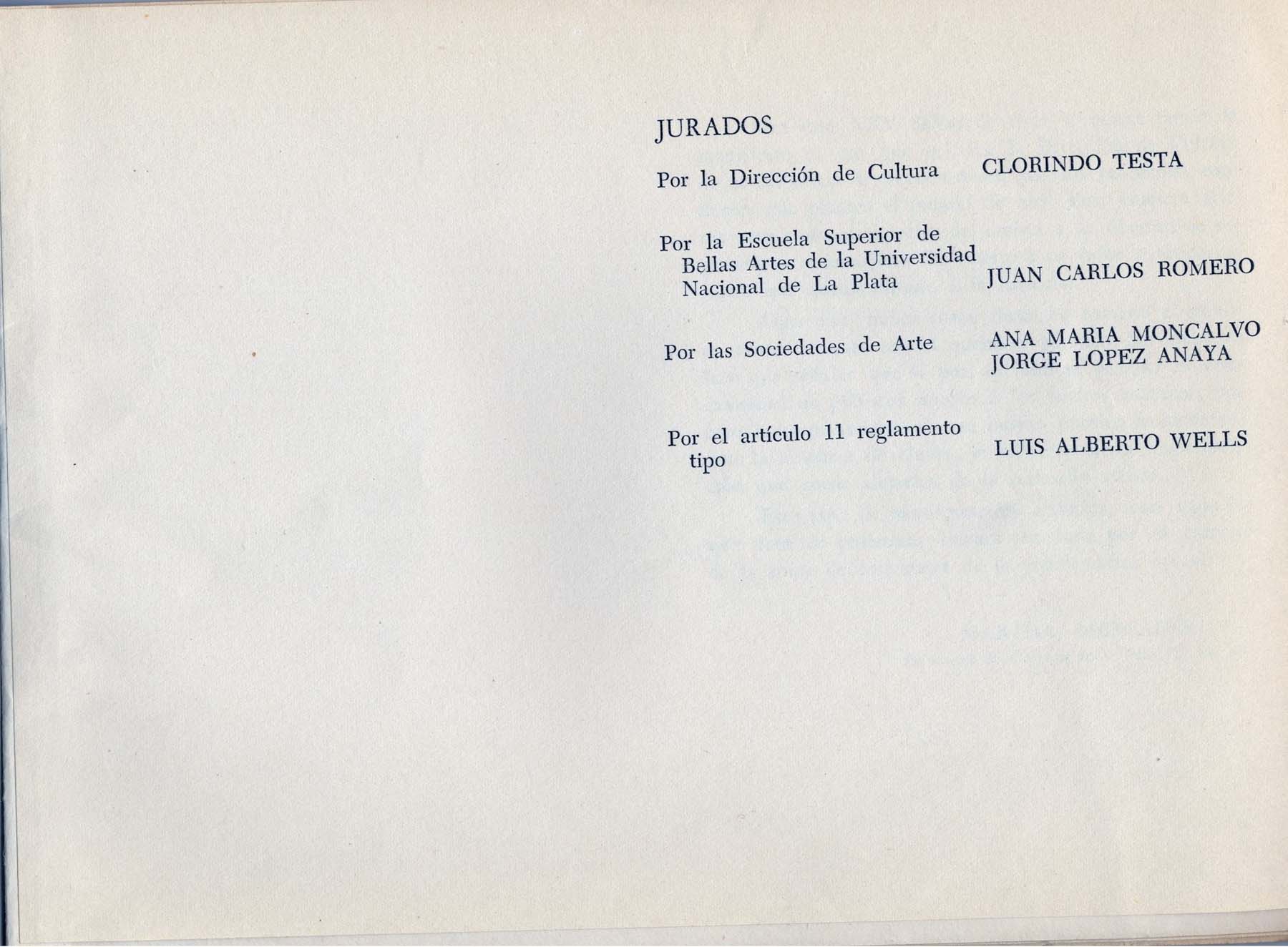 Jurado por la Escuela Superior de Bellas Artes de La Plata. Participan, entre otros: Aizenberg, Alvarez, Ambrosini, Bony, Brizzi, Cancela, Mesejan, Carreño, Cugat, Distefano, Durante, García, Jacoby, Kemble, Kochashian, Lamelas, Levyy, Luna Ercilla, Muñeza, Orensanz, Palacio, Paley, Paternosto, Puente, Renart, Santantonin, Scannapieco, Suárez, Trotta,