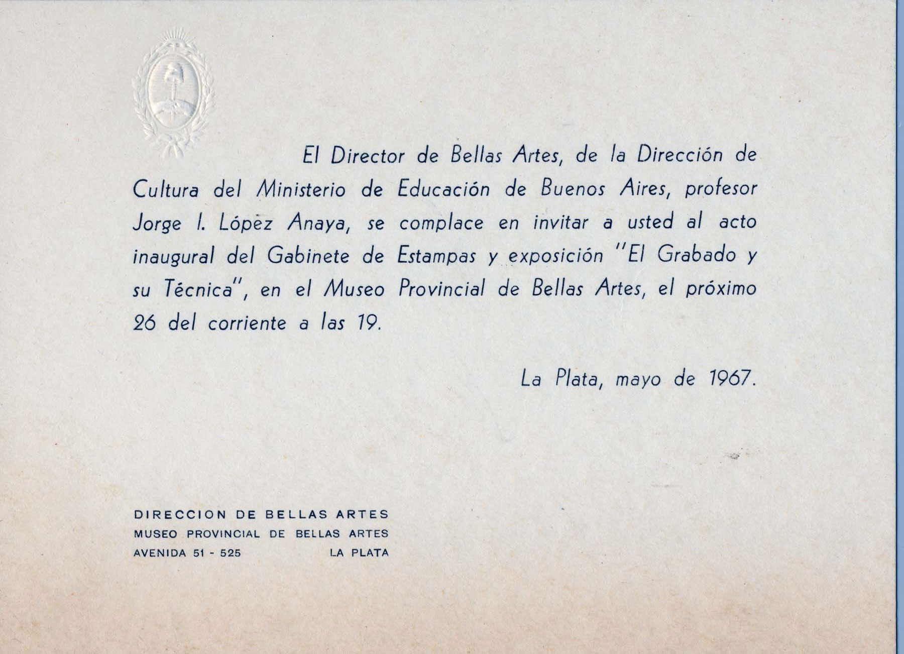 Invitación al acto inaugural del Gabinete de Estampas y Exposición "El Grabado y su técnica"MPBA. Director de Cultura del Ministerio de Educaciónde Bellas Artes, Jorge López Anaya.