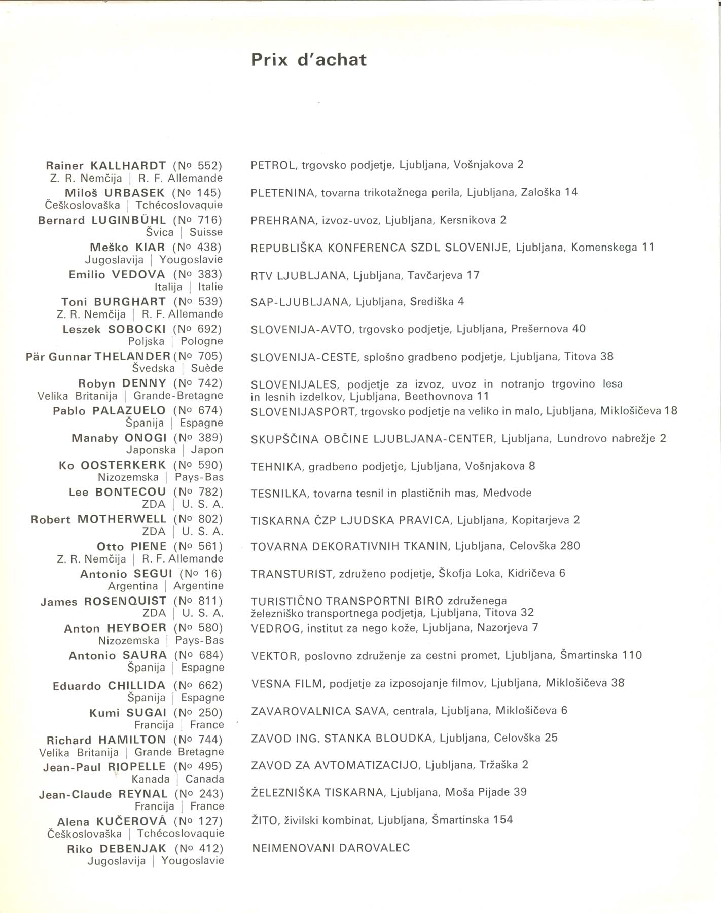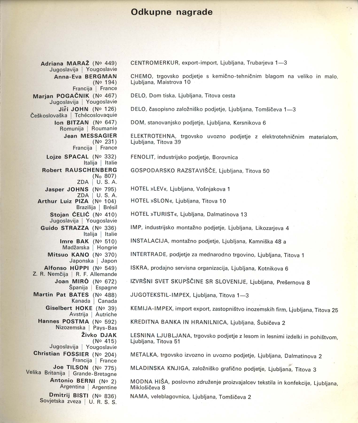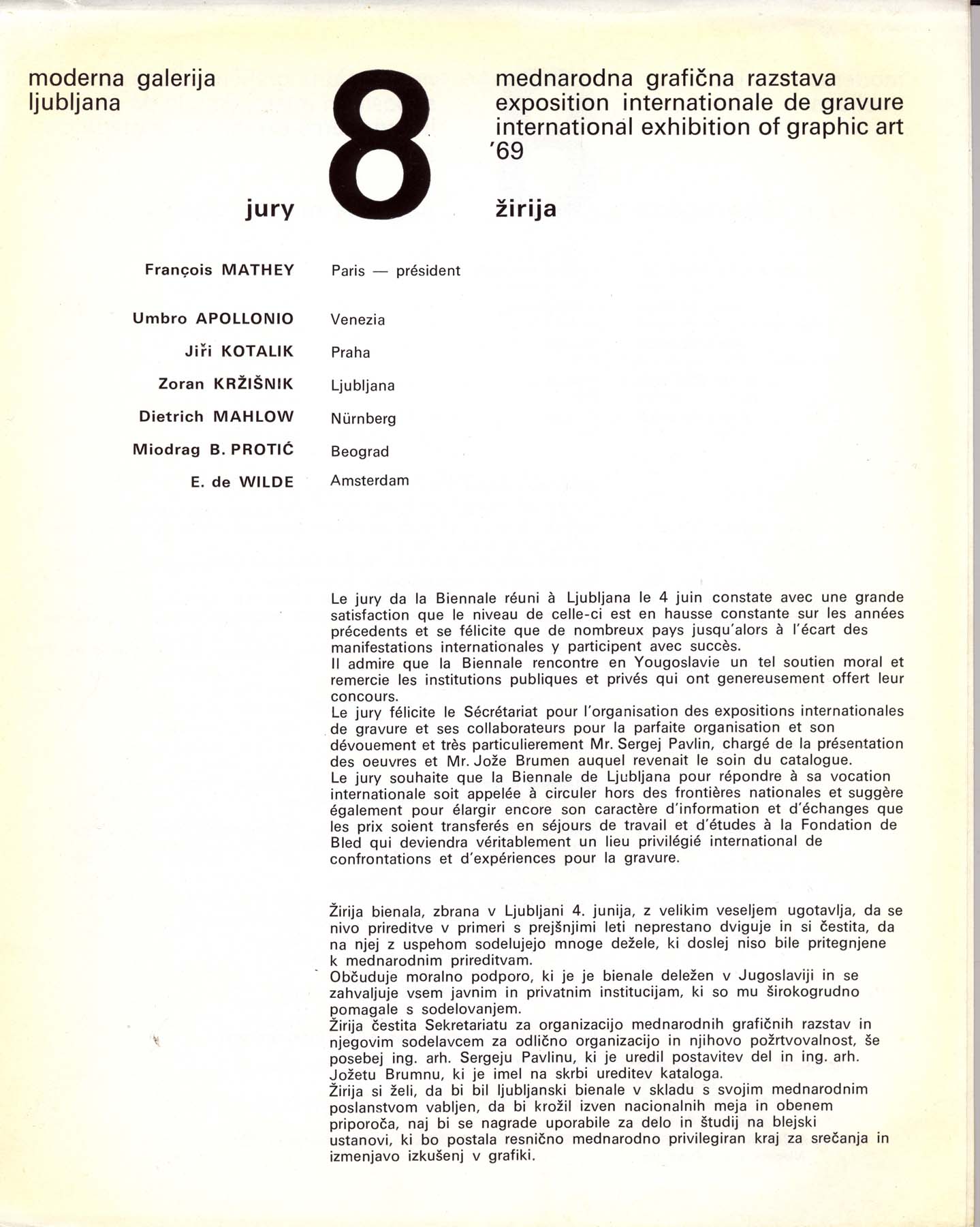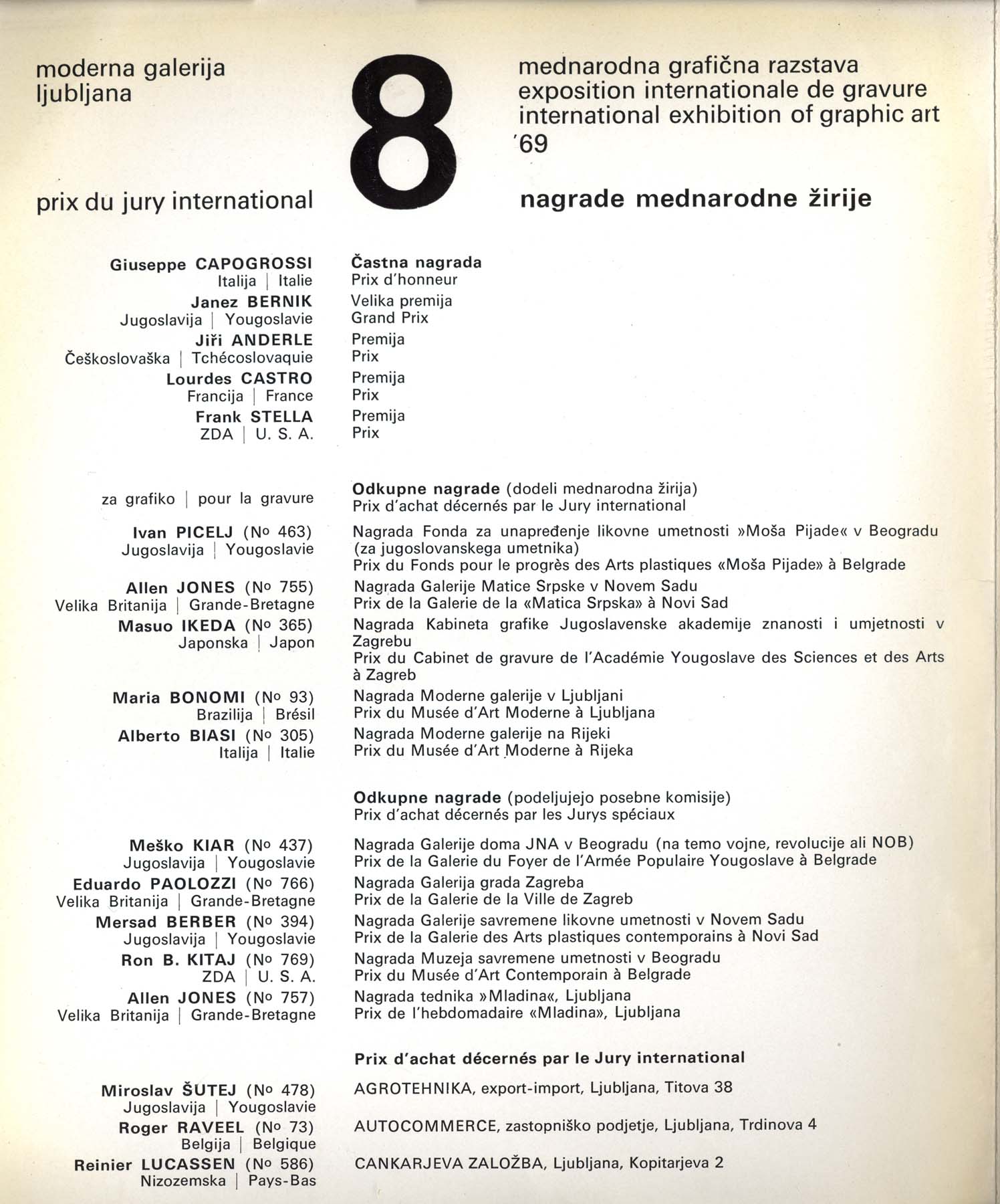 Expo de grabado. Participan, entre otros Ipcelj, Jones, Ikeda, Biasi, Kiar, Paolozzi, Berber, Kitaj, Raveel, Lucassen, Maraz, Bergman, Pogacnik, John, Messagier, Spacia, Johns, Piza, Bak, Kano, Postman, Bates, Tilson, Berni, Bisti, Kallhard, Kiar, Vedova, Bontecou, Segui, Reynal. Nota: Se encuentra en el interior del catálogo de la muestra. Delegación argentina: Berni, Kochashian, Lopez Anaya, Pacheco, Romero, Seguí. Participación con obra "O"