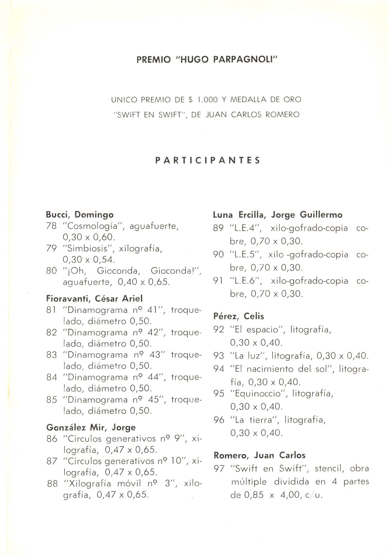 Participación con la obra "Swift en Swift", Stencil. Premio Hugo Parpagnoli. Texto Hugo Parpagnoli. Participan, entre otros: Aberastury, Barral, Bastos, Beccaria, Biglione, Caporaso, Castro, Ceconi, Díaz, Elissamburu, Fabre, Guerra, Gómez, Iturralde, Khöler, Lusich, Macchione, Montoya, Muñeza, Orlandi, Peri, Pietrantonio, Piñeiro, Rappaport, Resnik, Rodríquez, Sanchez, Santander, Scvetz, Seguí, Soler, Tau, Valdez, Vigo, Zar, Zariquiegui; Bucci, Fioravanti, Gonzalez Mir, Luna Ercilla, Pérez Celis, Romero, . Jurado: Fevre, Anaya, Del Villano.