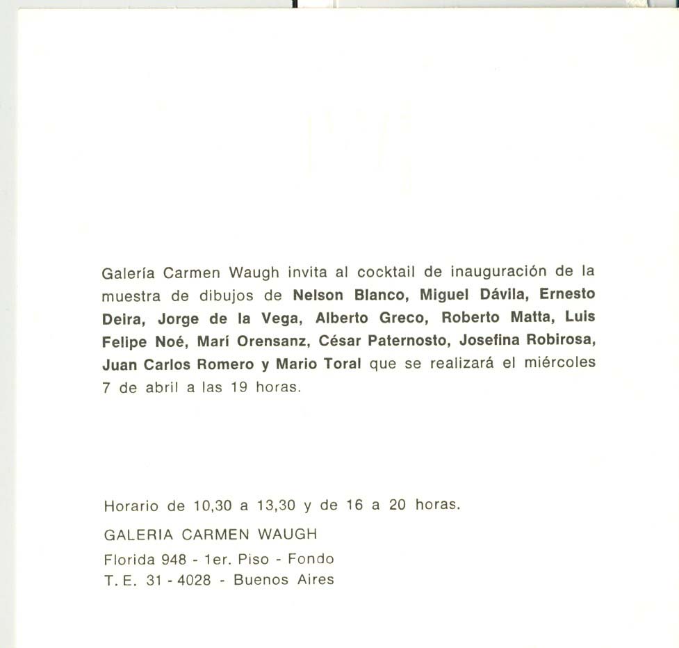 Muestra de dibujos de: Nelson Blanco, Miguel Dávila, Ernesto Deira, Jorge de la Vega, Alberto Greco, Luis Felipe Noé, Roberto Matta, Marí Oresanz, César Paternoso, Josefina Robirosa, Juan Carlos Romero, Mario Toral.