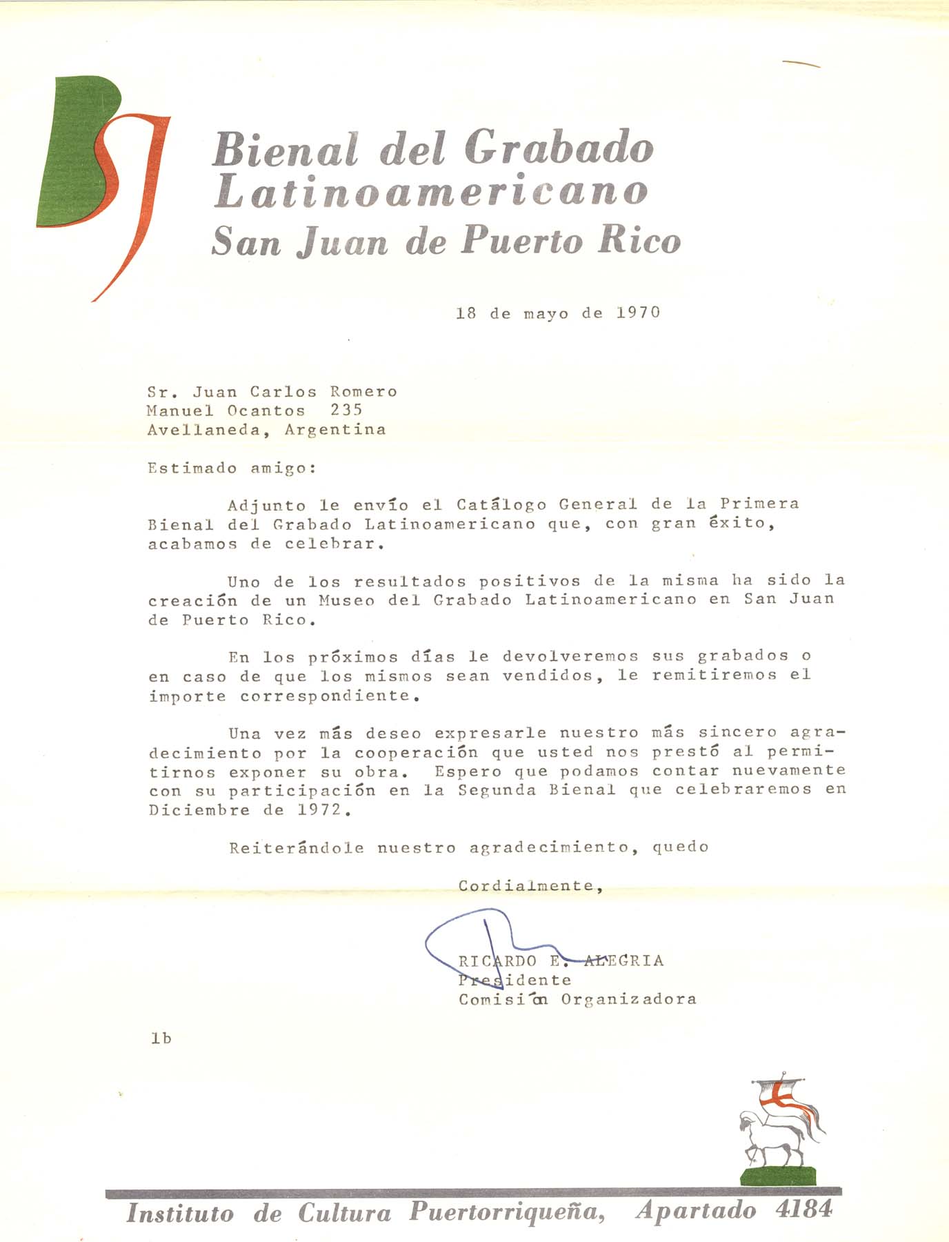 Carta de Ricardo Alegría, presidente de la Bienal de Grabado Latinoamericano de San Juan de Puerto Rico. Nota: se encuentra en el interior del catálogo de la Exposición.