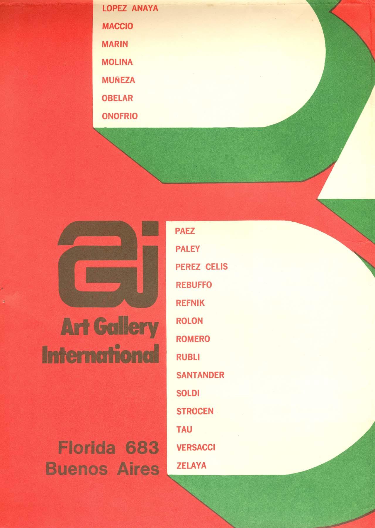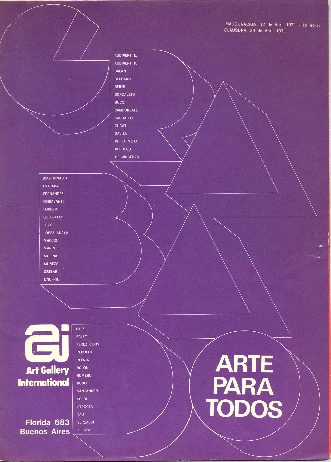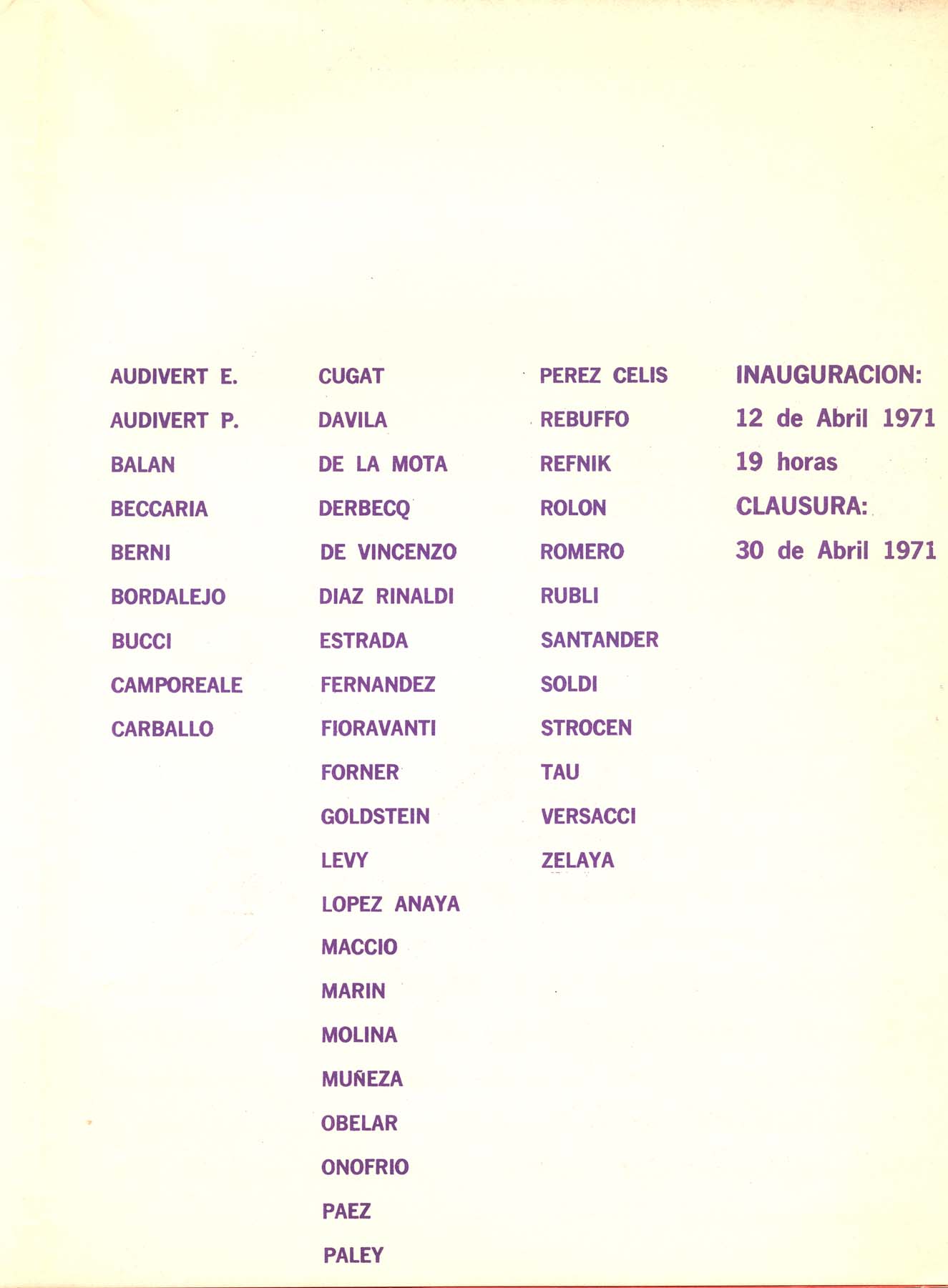 Muestra colectiva: Audivert, P; Audivert E; Balan; Beccaria, Berni, Bordalejo; Bucci; Camporeale; Carballo; Cugat; Davila; De la Mota; Derbecq; De Vicenzo; Díaz Rinaldi; Estrada; Fioravanti; Forner; Goldstein; Levy; Lopez Anaya; Machio, Marin; Molina; Muñeza; Obelar, Onofrio; Perez Celiz; Parey; Paez; Rebuffo; Refnik; Rolon, Rufnik, Santander; Soldi; Strucen, Tau; Versacci, Zelaya.