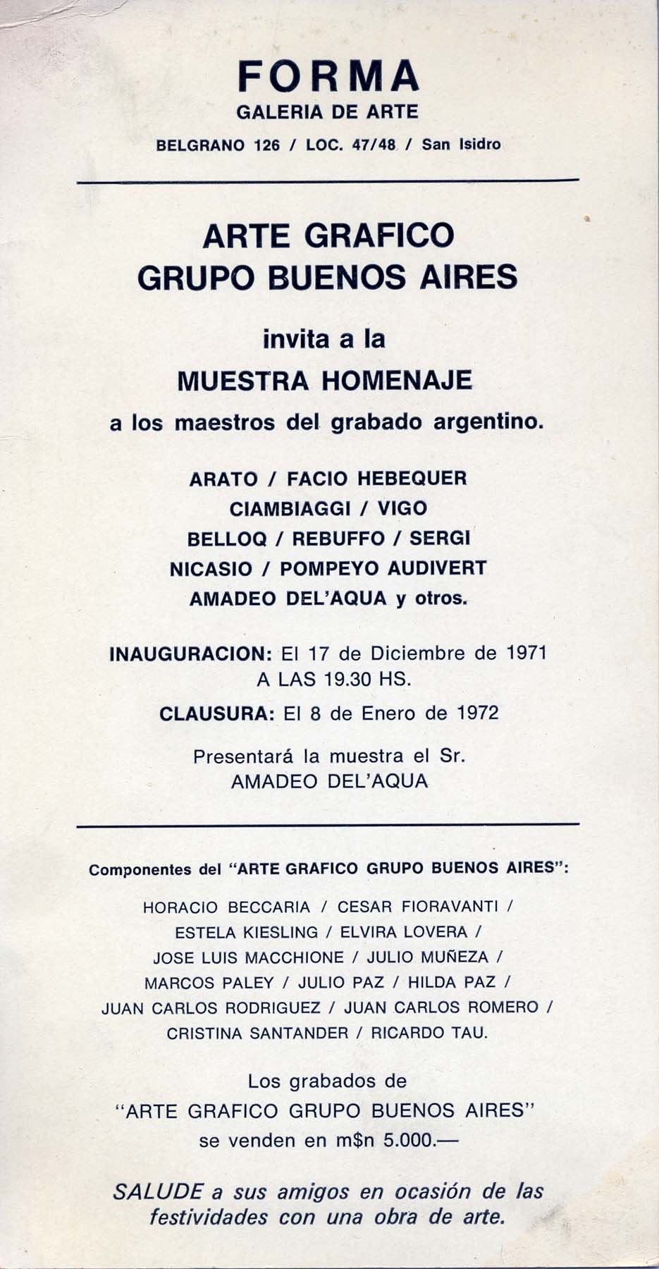 Exhibición colectiva de Arte Gráfico Grupo Buenos Aires: Beccaria, Fiorovanti, Kiesling, Lovera; Macchione; Muñeza; Paley; Julio Paz, Hilda Paz; Rodriguez, Santander; Tau; Presenta muestra: Amadeo Del'Aqua
