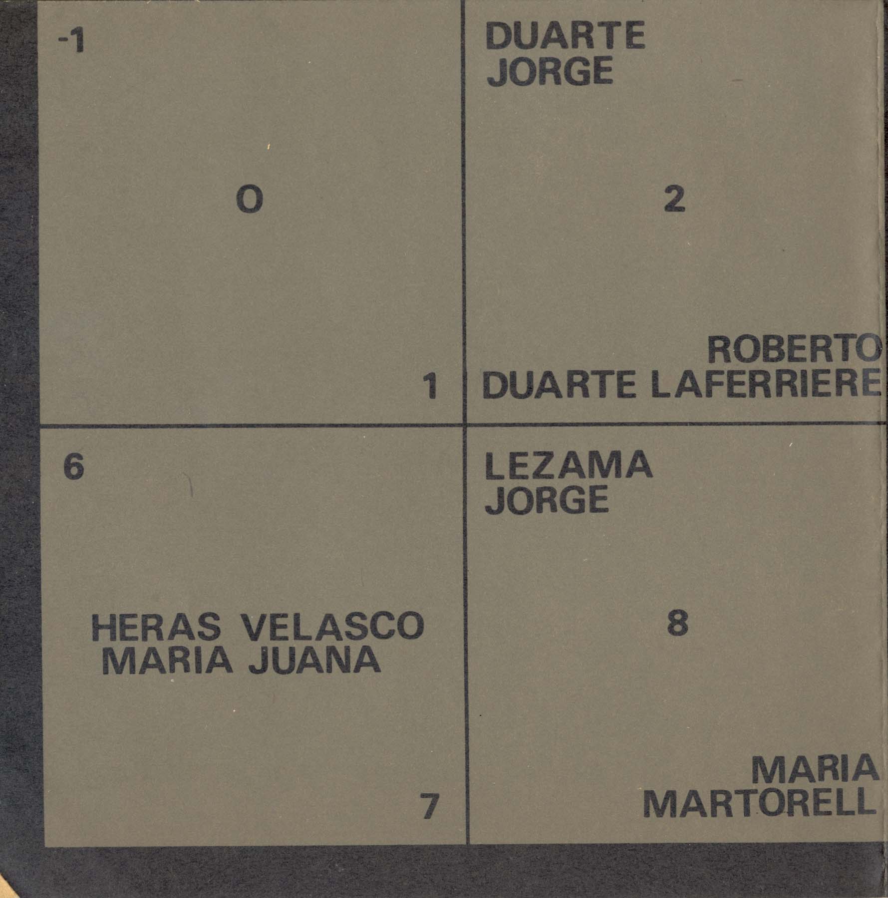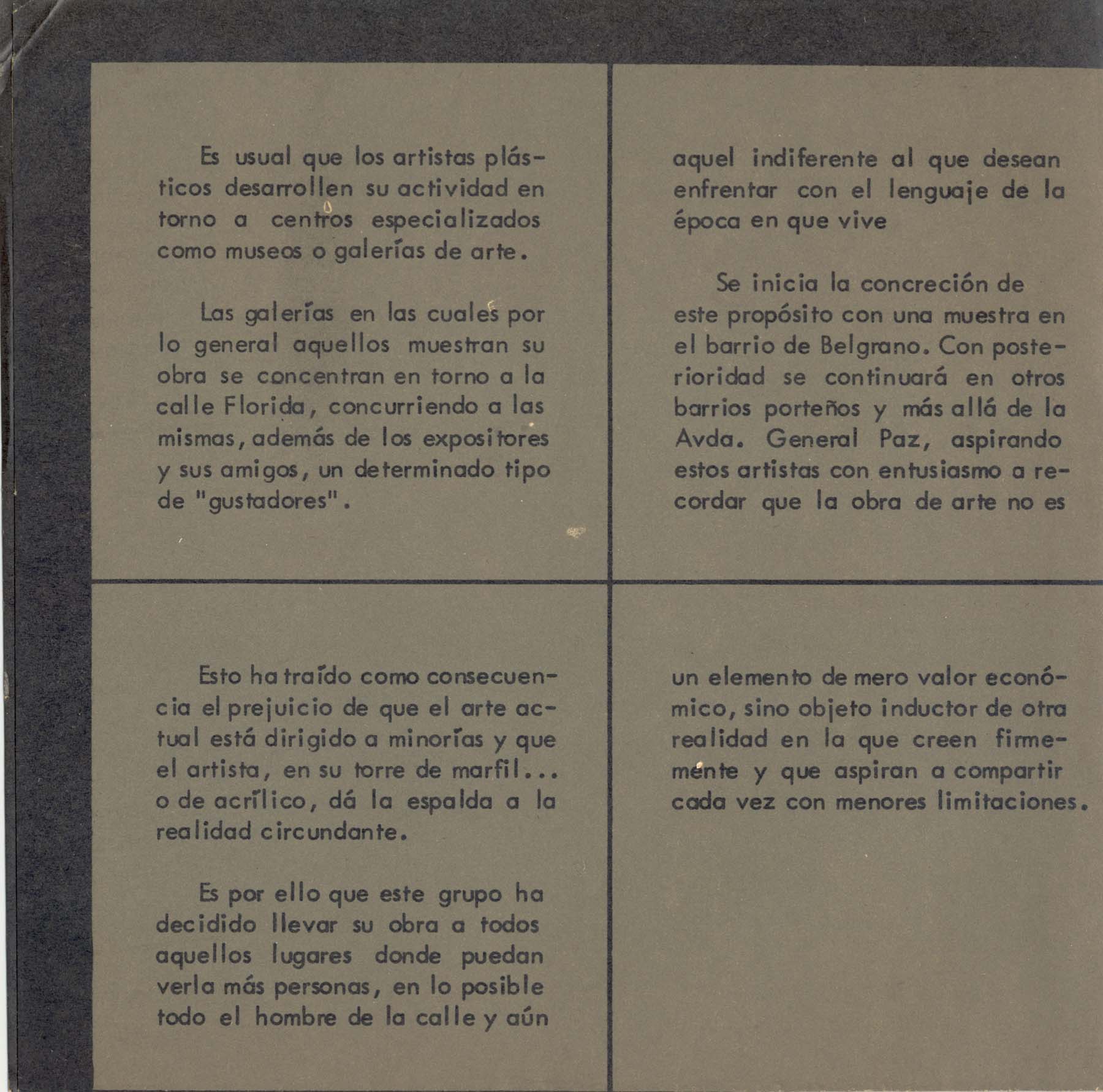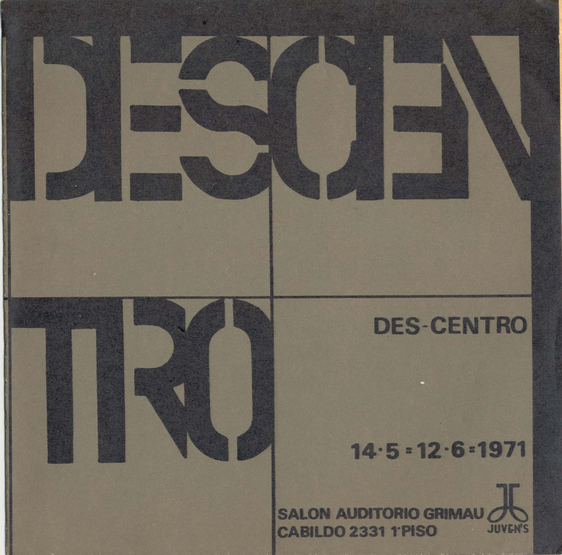 Exhibición Grupo Des-Centro: Jorge Duarte, Roberto Duarte Laferrere, Maria Juana Heras Velasco,Jorge Lezama, María Martorell, Manuel Espinosa, Cesar Fioravanti, Jorge Gamarra, Emilio Renart, Ricaro Roux. Texto manifiesto de los artistas.