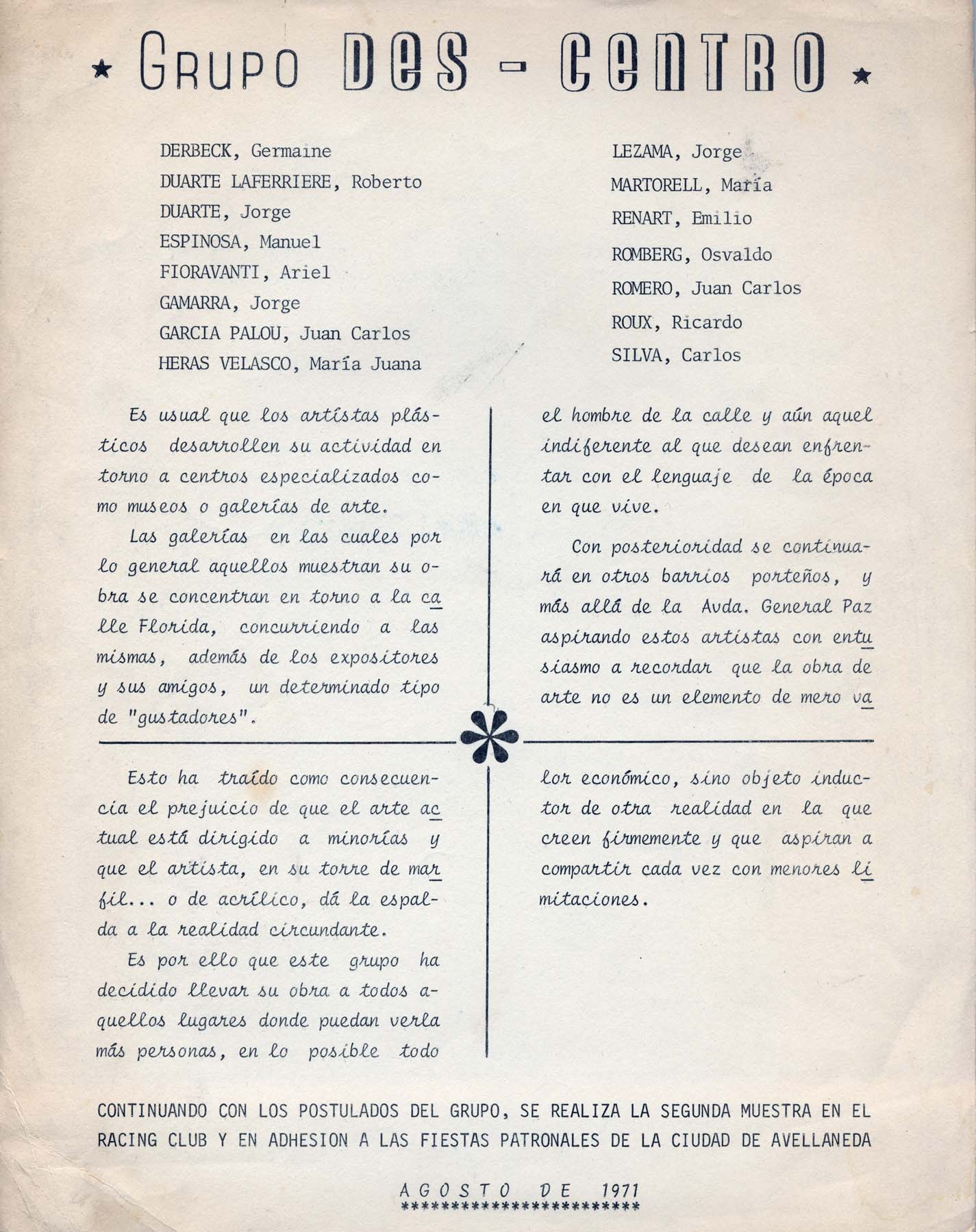 Folleto. Exhibición Grupo Des-Centro: Jorge Duarte, Roberto Duarte Laferrere, Maria Juana Heras Velasco,Jorge Lezama, María Martorell, Manuel Espinosa, Cesar Fioravanti, Jorge Gamarra, Emilio Renart, Ricaro Roux. Texto manifiesto de los artistas.