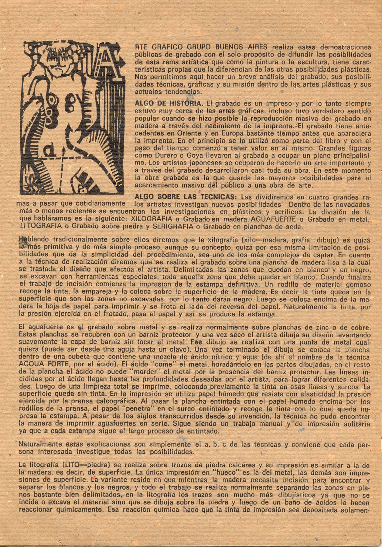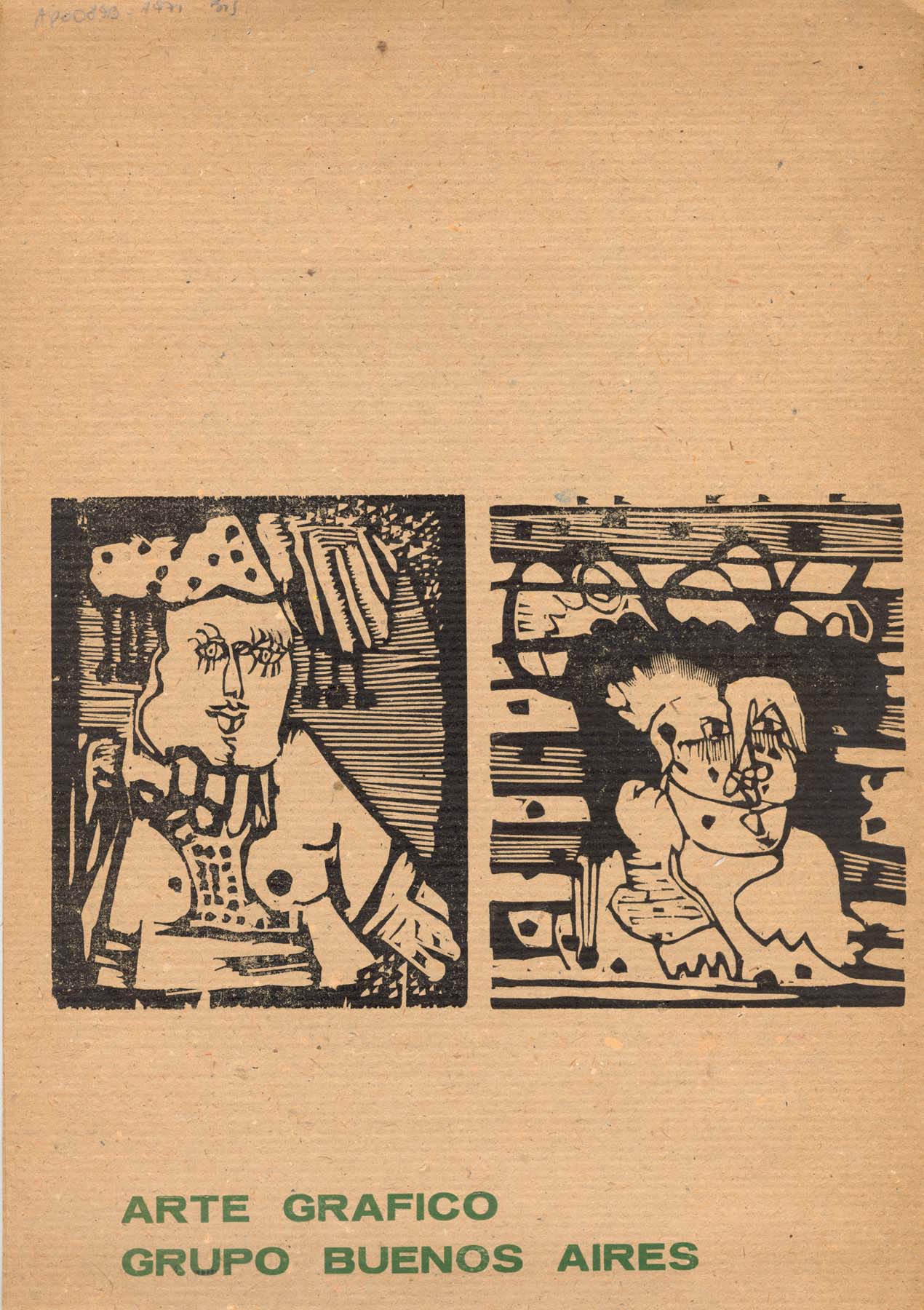 Exposición Grupo Buenos Aires de Arte Gráfico: Beccaría, Fabre, Fioravanti, Gómez, Kiesling, Lovera, Machione, Muñeza, Paley,J.Paz, L.Paz, Rodríguez, Romero, Santander, Scannapieco, Tau, Weiss, Zar, Zariquiegui. Incluye texto de los artistas. Nota: en estante se encuentra con tipografía de tapa y contratapa en verde.