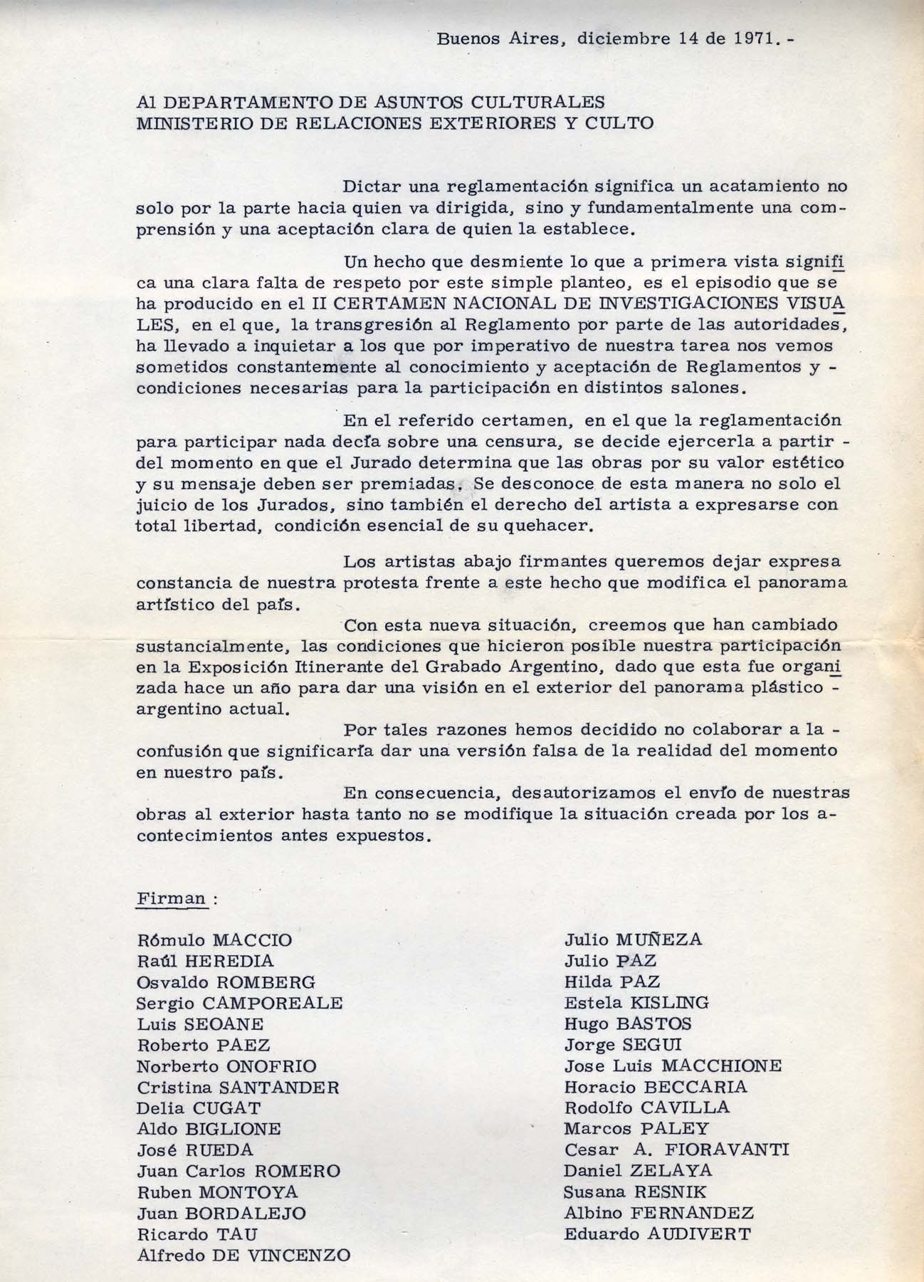Carta de los artistas del II Certámen Nacional de Investigaciones Visuales al Departamento de Asuntos Culturales. Repudio por censura acaecida.