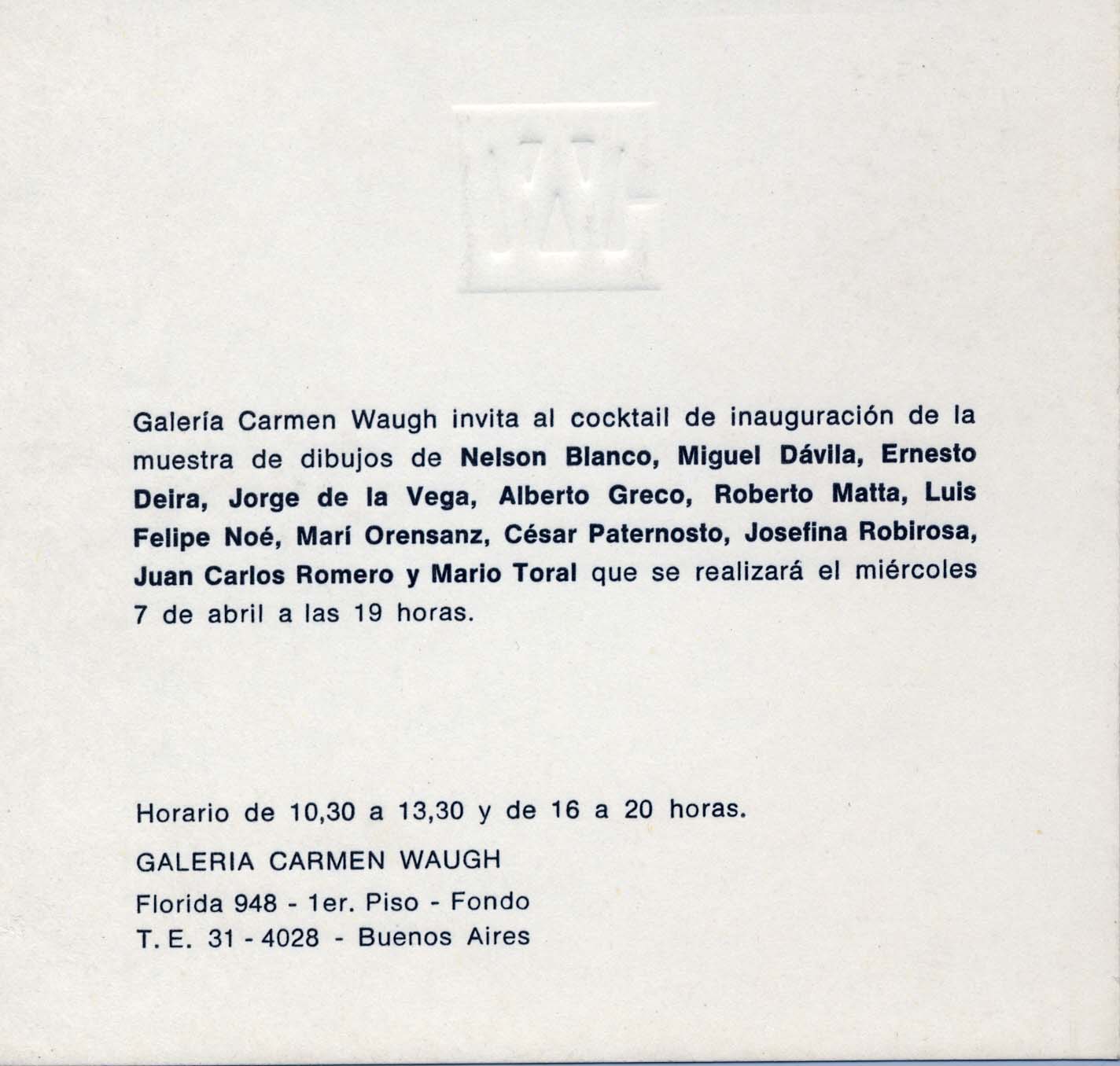 Documento repetido en esta caja. Muestra de dibujos de: Nelson Blanco, Miguel Dávila, Ernesto Deira, Jorge de la Vega, Alberto Greco, Luis Felipe Noé, Roberto Matta, Marí Oresanz, César Paternoso, Josefina Robirosa, Juan Carlos Romero, Mario Toral. Nota: es de 1970 pero está repetida en folio 1971.