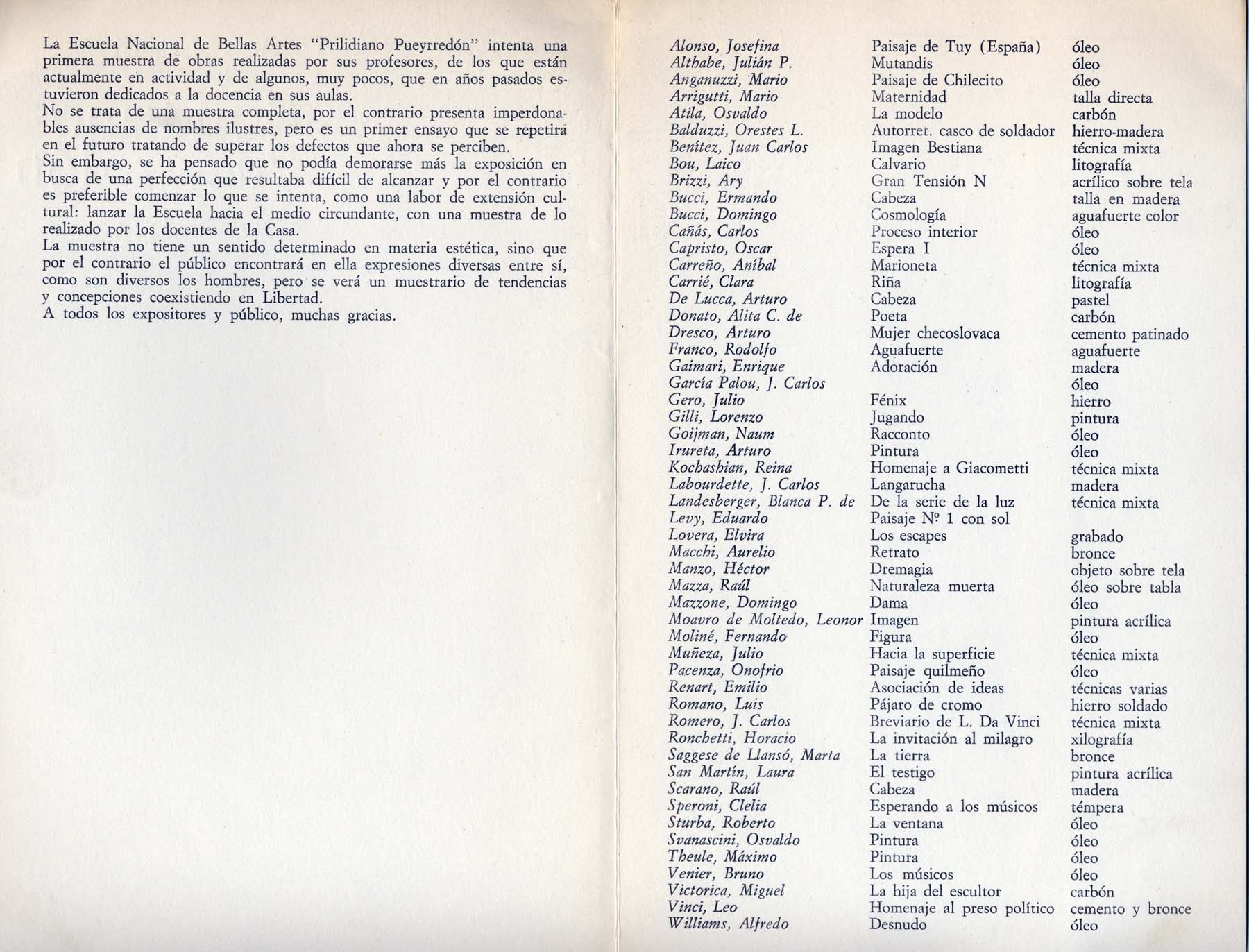 Primera exhibición de docentes de la Escuela Nacional Prilidiano Pueyrredon. Participan, entre otros: García Palau, Gilli, Mazzone, Renart. Participación con la obra: Breviario de L. Da Vinci.