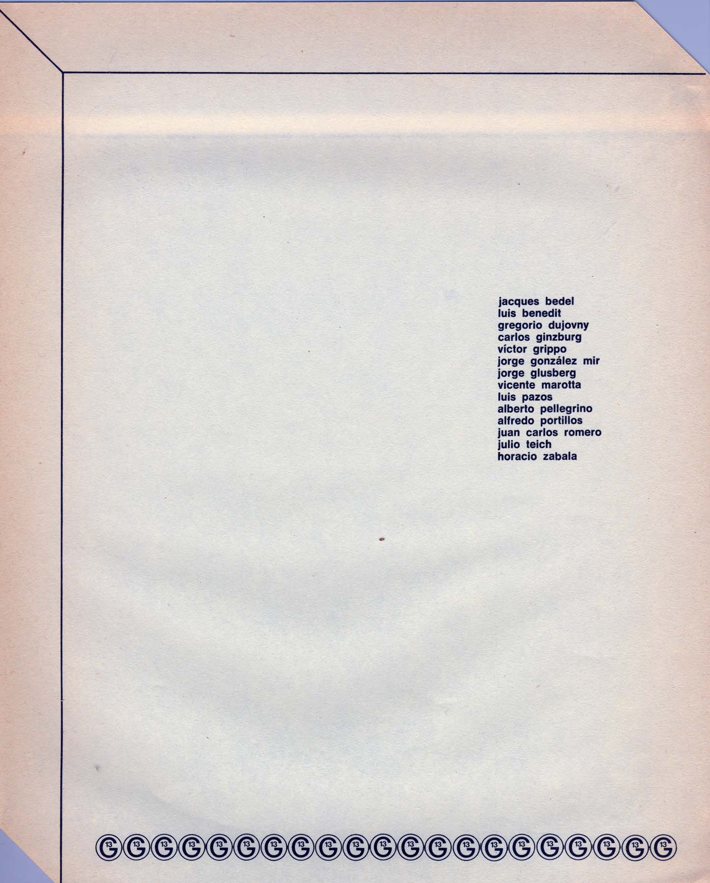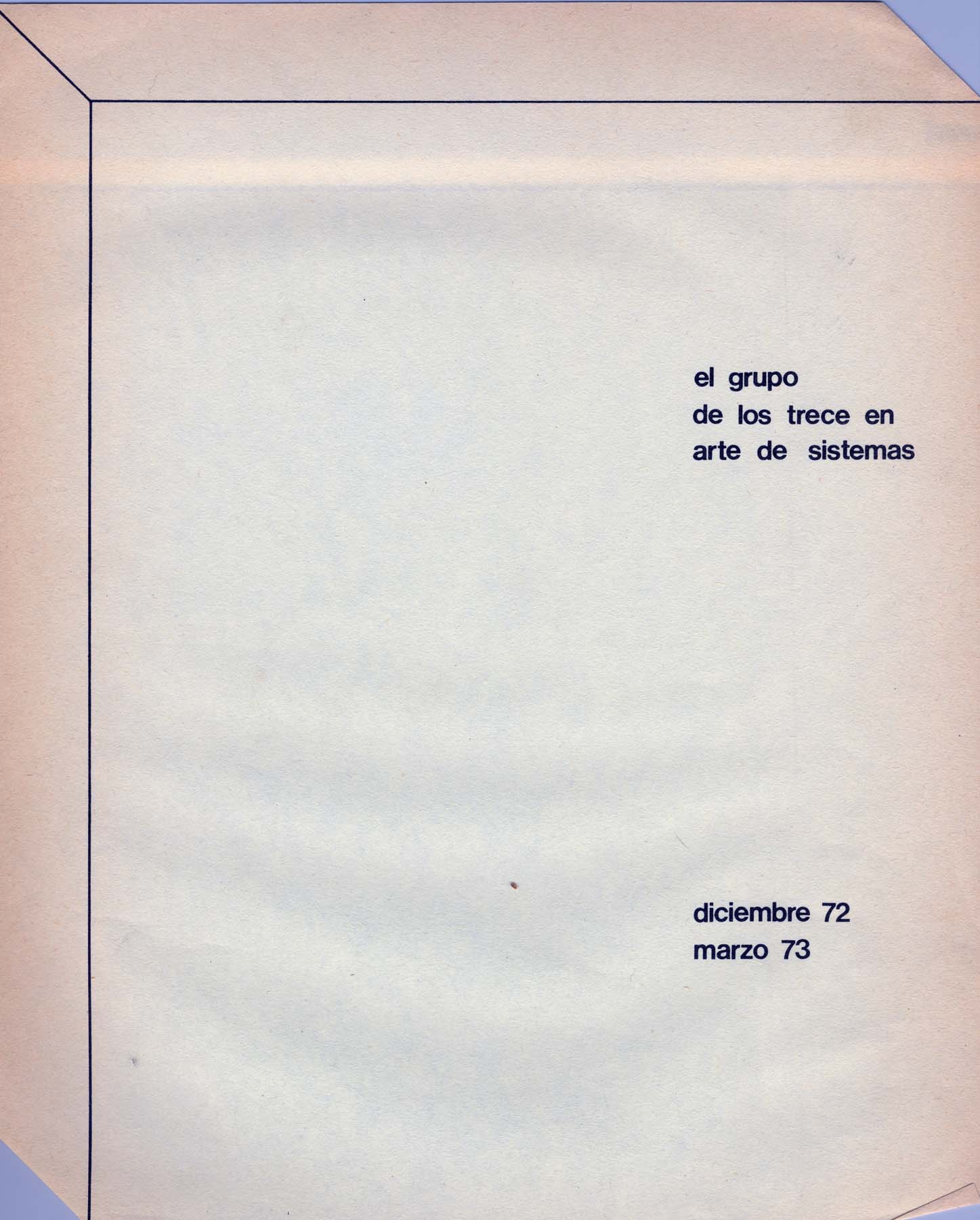 CAYC El grupo de los trece en arte de sistemas. Carpeta que contiene 27 hojas con obras de diferentes artistas: Bedel, Benedit, Dujovny, Ginzburg, Grippo, González Mir, Glusberg, Marotta, Pazos, Pellegrino, Portillos, Romero, Teich, Zabala. Fechado entre diciembre 1972- marzo 1973