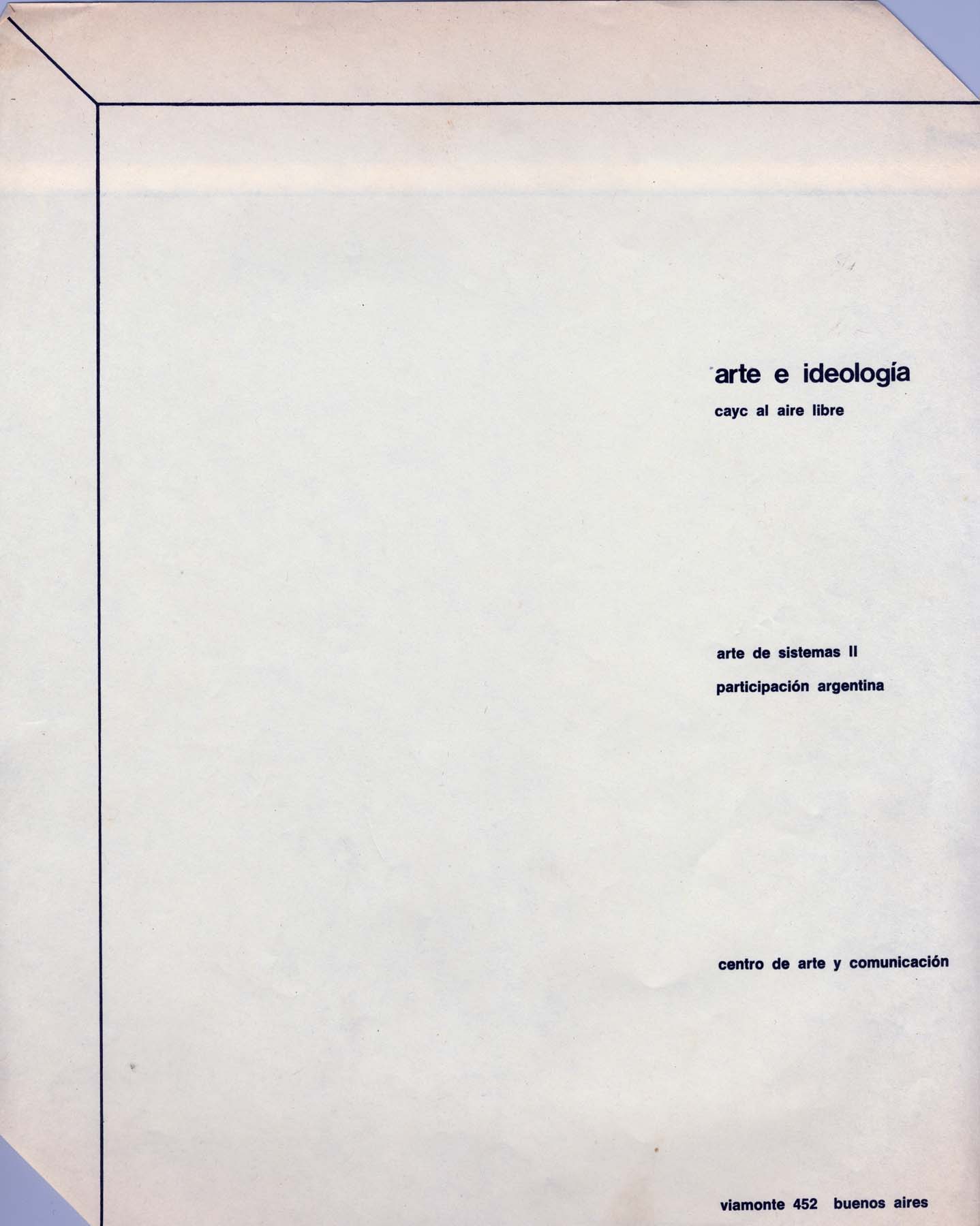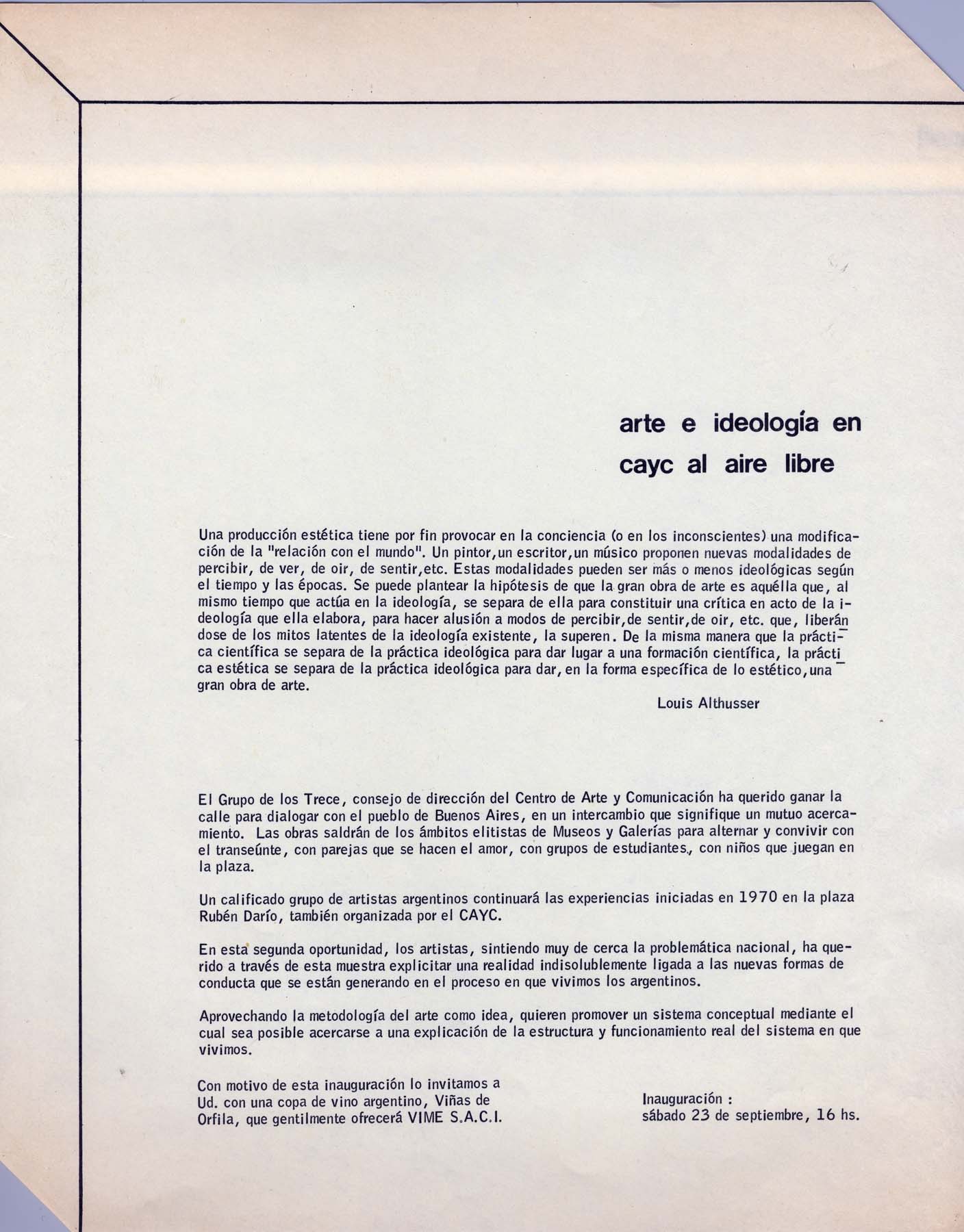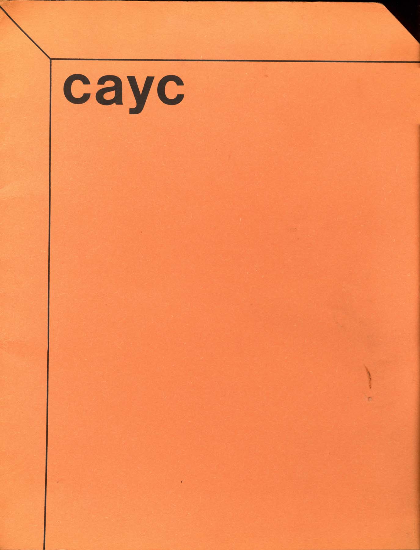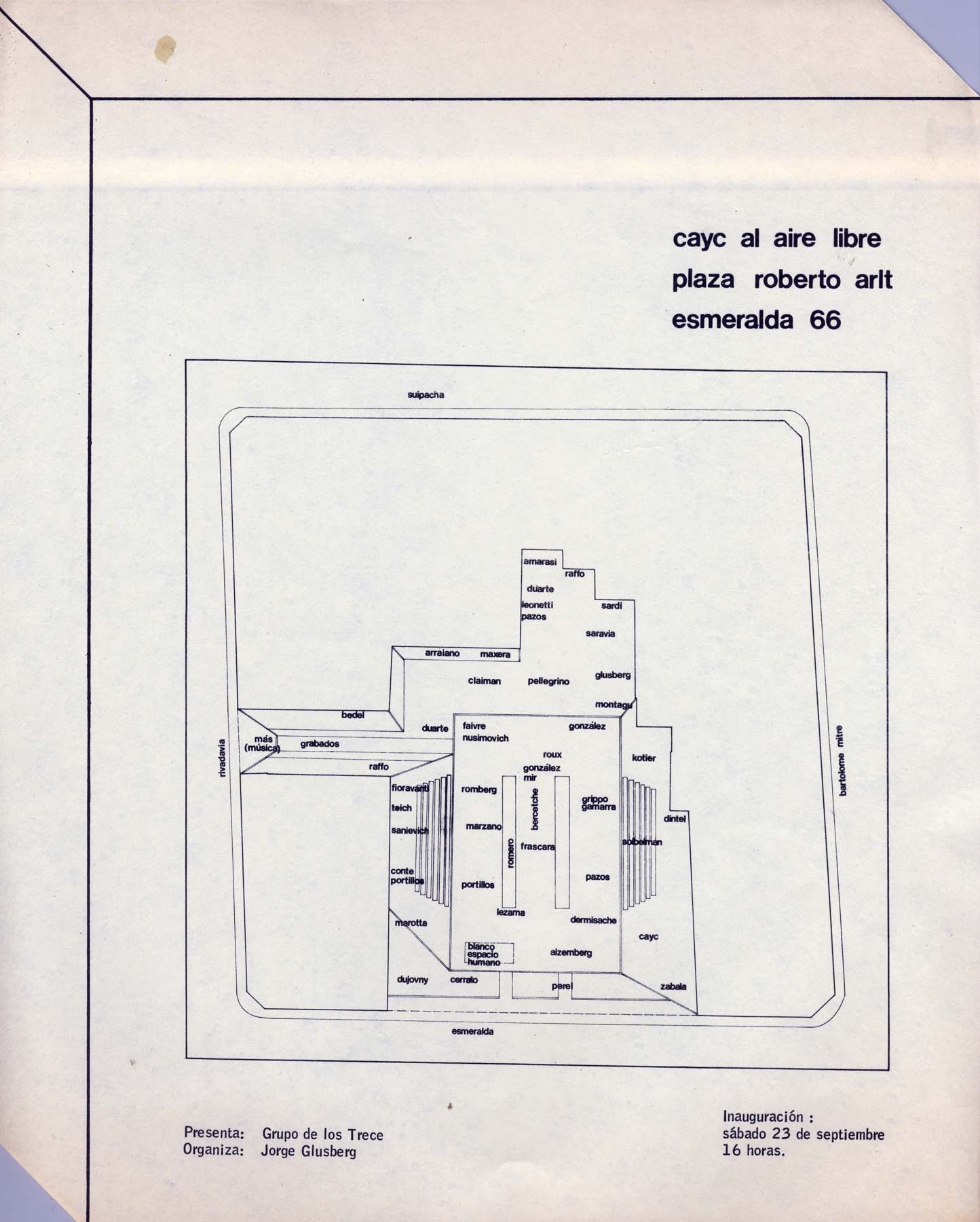 Carpeta de cartulina con hojas Cayc. Actividad realizada en la plaza Ruben Darío. Presenta Grupo de los trece. Organiza Jorge Glusberg. Participan: Zabala, Cayc, Pazos, Dermisache, Perel, Pazos, Solbelman, Dintel, Kotier, Gonzáles, Grippo, Gamarra, Pazos, Lezama, Frascara, Berceteche, Gonzáles Mir, Roux, Faivre, Nusimovich, Romberg, Marzano, Portillos, Romero, Blanco Espacio Humano, Cerrato, Dujovny, Marotta, Conte, Portillos, Sanievich, Teich, Fioravanti, Raffo, Duarte, Bedel, Claiman, Pellegrino, Montagu, Glusberg, Saravia, Sardi, Raffo, Duarte, Amarasi, Leonetti, Pazos, Maxera, Arraiano, Duarte, Claiman, Bedel