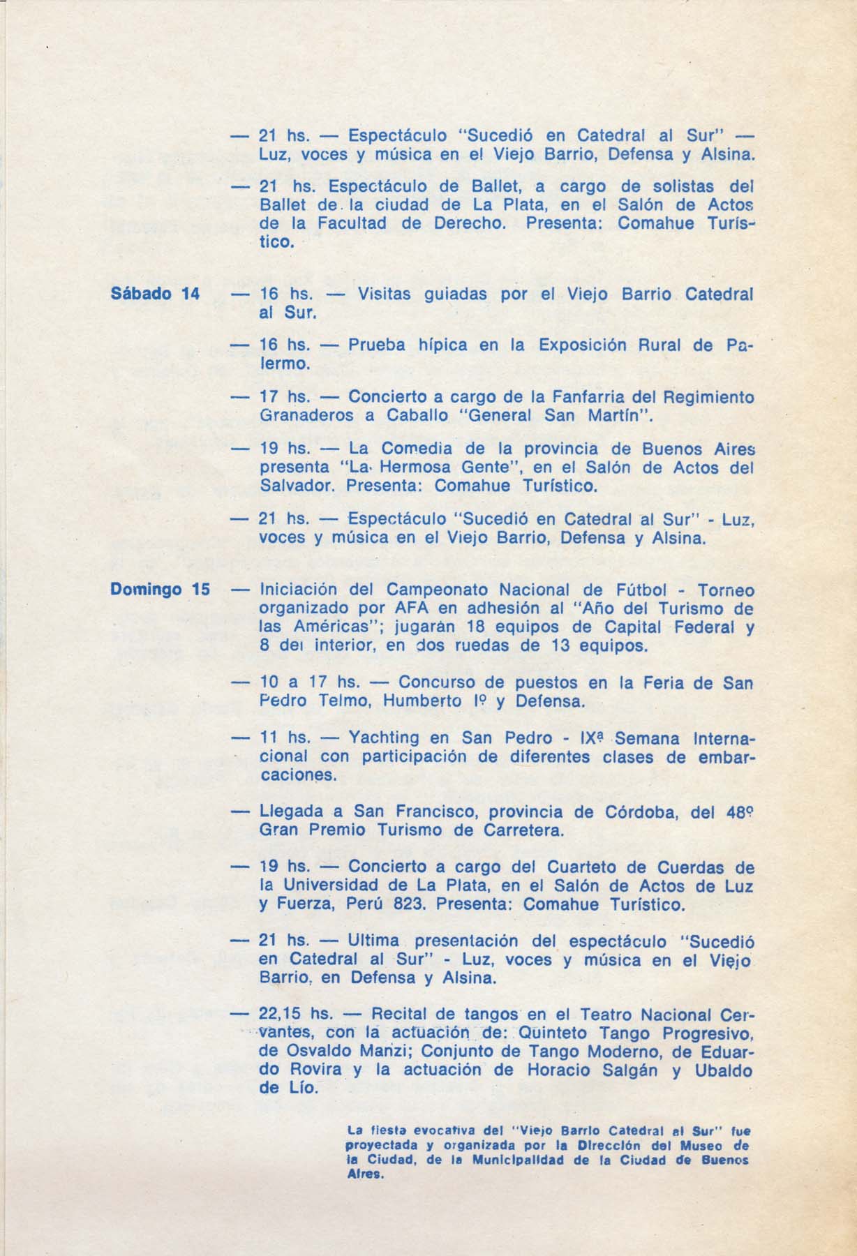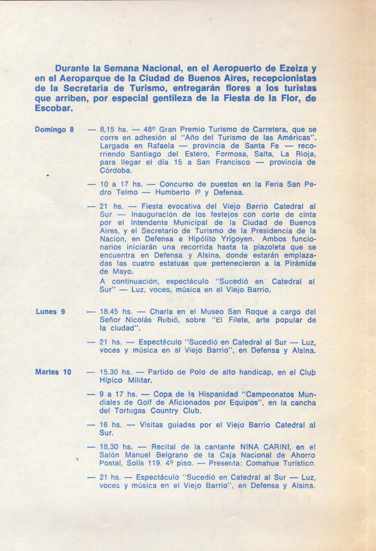 Semana Nacional del Turismo. Año del turismo de las américas. Anuncio Grupo Arte Gráfico de Buenos Aires. Experiencias sobre técnicas de grabado en Defensa y Alsina. Participan: Beccaría, Fioravanti, Kiesling, Machione, Muñeza, Paley, Rodríguez, Romero, Scannapieco, Tau.