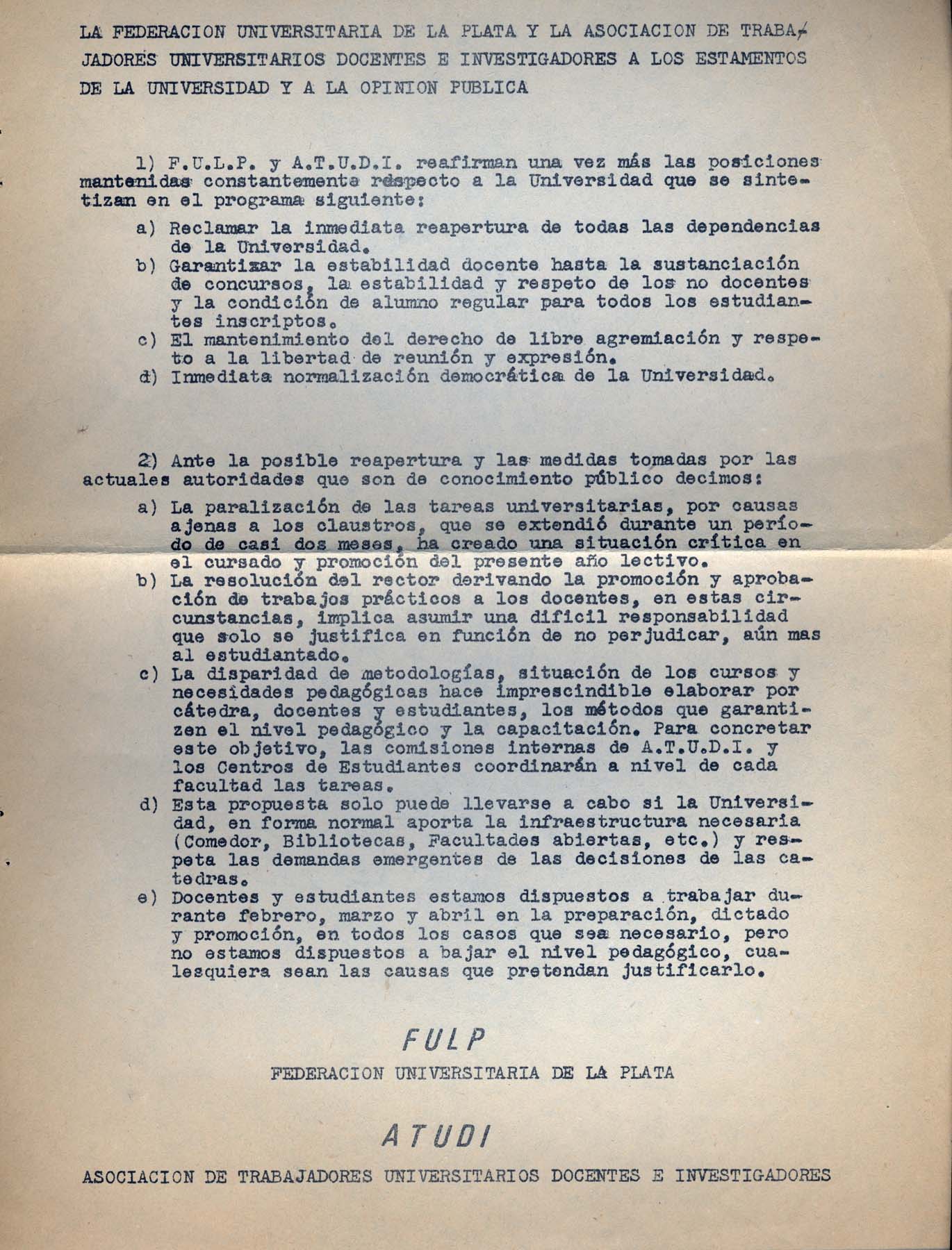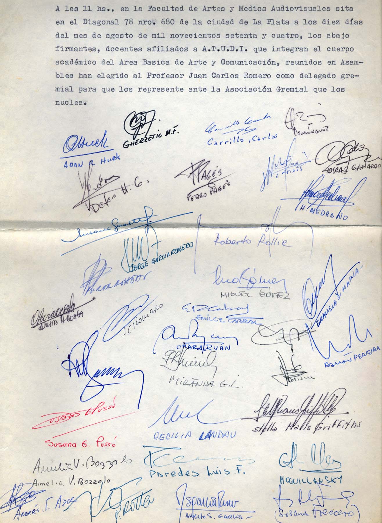 Carta de la Federación Universatria de La Plata y la Asoaciación de trabajadores Universtiario docentes e investigadores a los estamentos de la Universidad y a la opinión pública. La Facultad de Bellas Artes designan a Juan Carlos Romero como delegado gremial para que los represente ante la Asociación Gremial que los nuclea. Documento Firmado