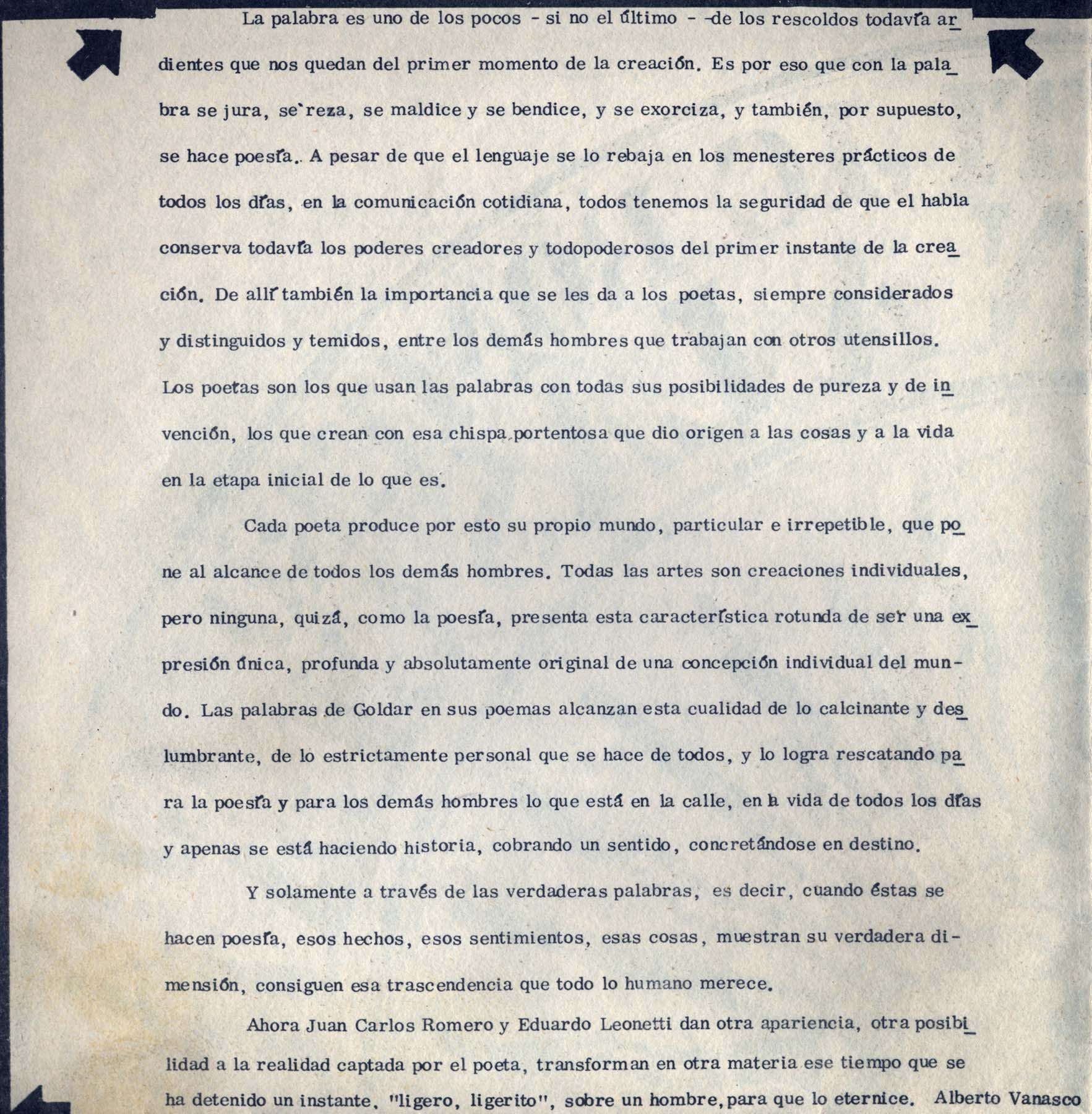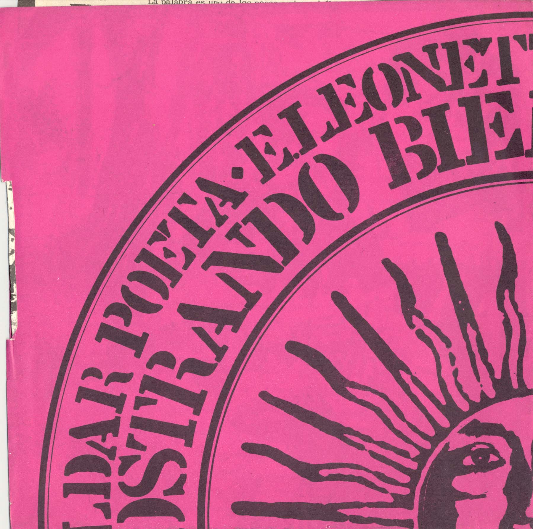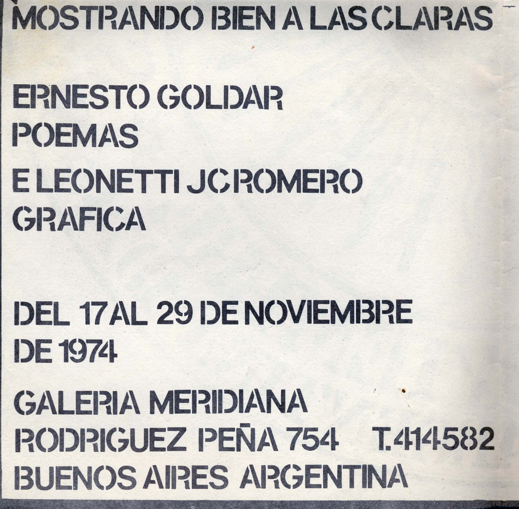 Ernesto Goldar Poemas / E. Leonetti, Romero Grabado. Texto de Alberto Vanasco. Póster desplegable, contiene texto e imagen. Color magenta.