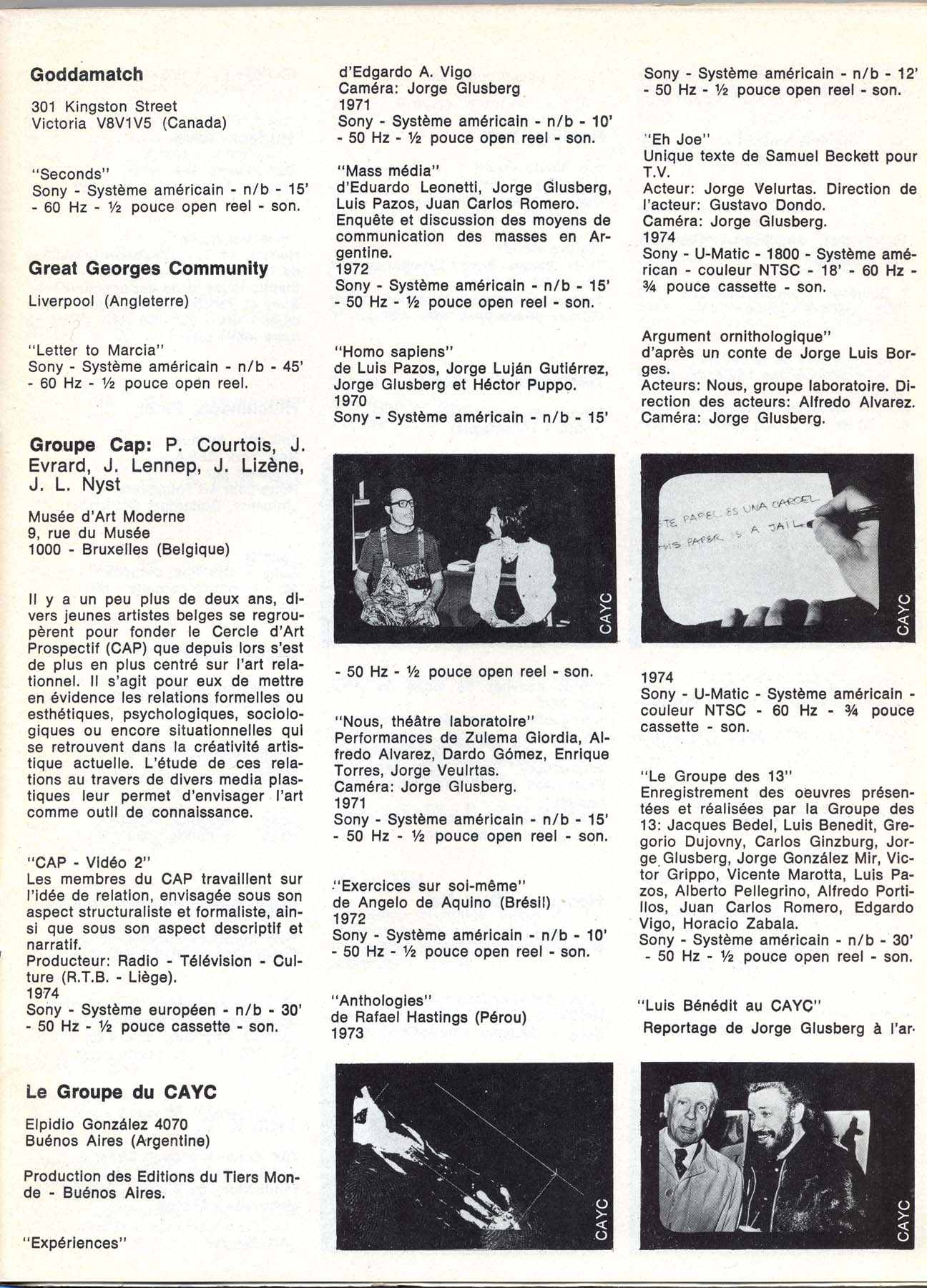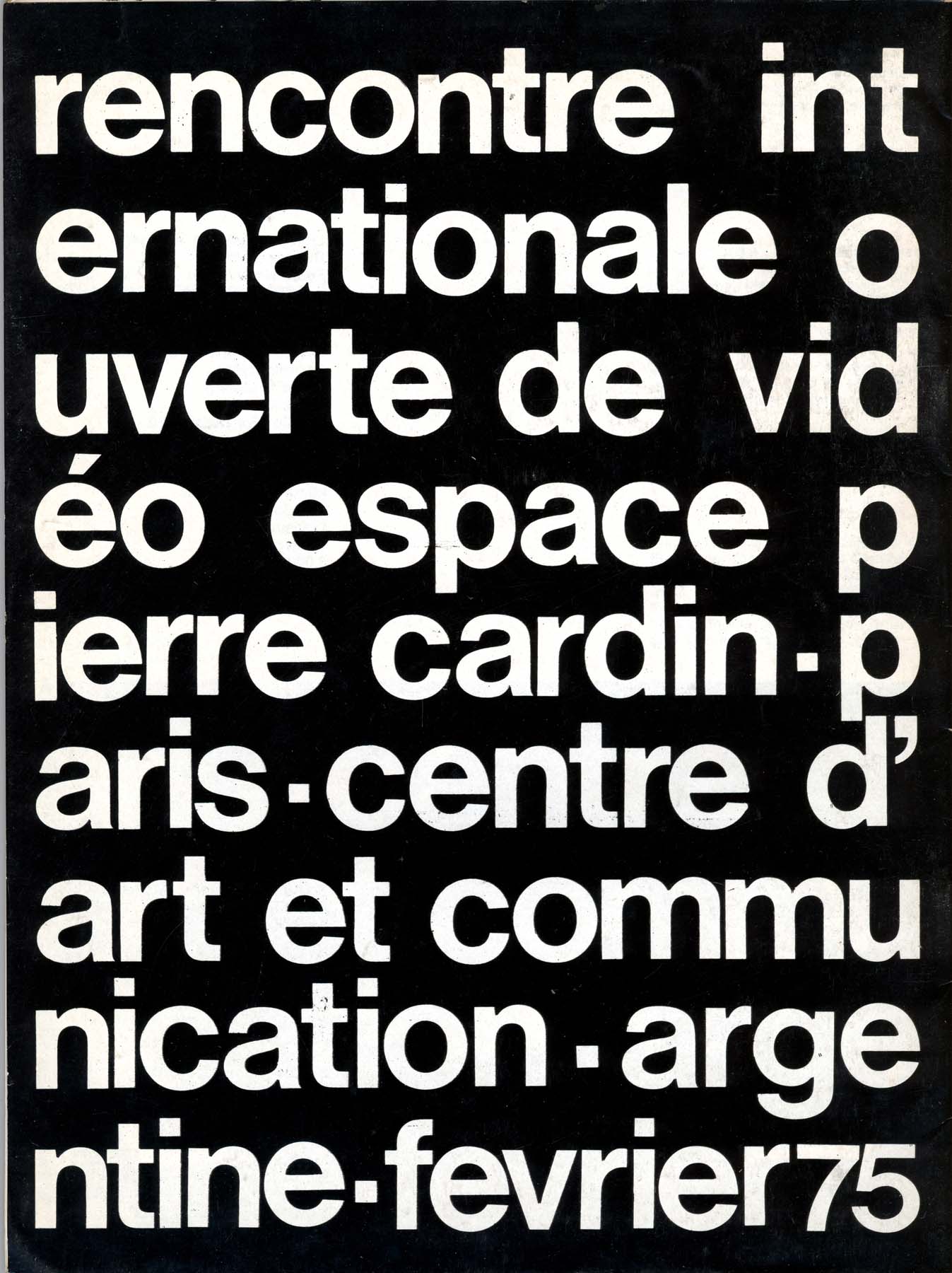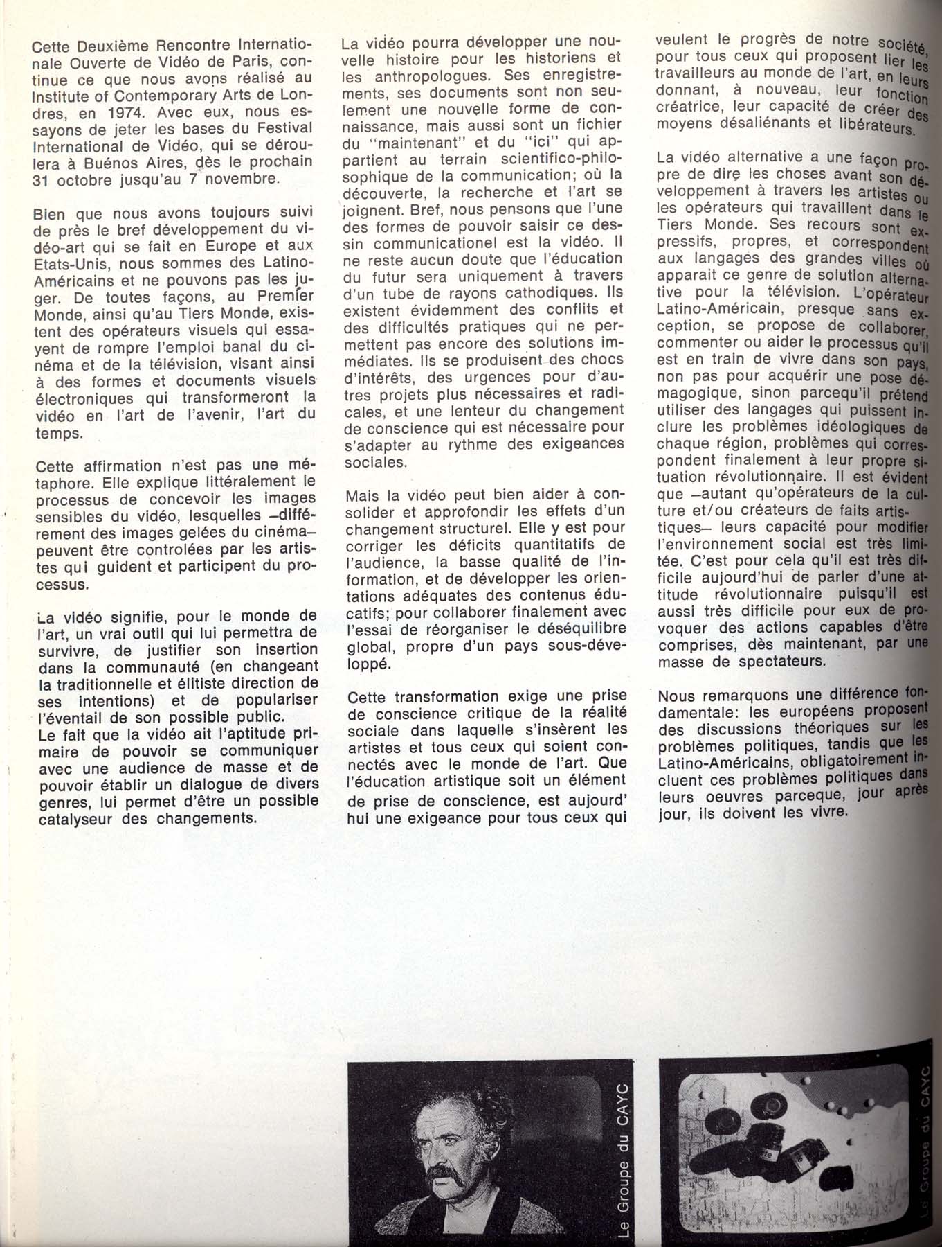 Encuentro Internacional de video en Francia. Texto inicial de Jorge Glusberg. Participan, entre otros: Abramovic, Agnetti, Albright, Alleyn, Altmann, Andersen, Antin, Baladi, Bauermeister, Belloir, Verbizh, Bonnier, Bonora, Breloh, Bucan, Burgy, Byerley, Cardena, Carey, Cerberus, Clareboudt, Cort, Crivelli, Chartier, Chiari, Davis, Druks, Ehrenberg, Electron, Fabro, Fandangos, Flesher, Forest, Foz, Germana, Gerz, Gette, Giaccari, Giler, Goddamatch, Group Cap, Cayc - Vigo, Leonetti, Glusberg, Romero, Lujan Gutierrez, Giodia, Alvarez, Gomez, Torres, Veuirtas, Hastings, Bedel, Benedit, Dujovny, Ginzburg, Grippo, Marotta, Pazos, Pellegrino, Portillos, Romero, Vzabala- Guyonnet, Hale, Harding, Hompson, Hudson/tava, Hutchinson, Limura, Imai, Irick, Ivekovic, Janicot, Journiac, Kahlen, Kaprow, Kiser, klinkowstein, Kristi, La pietra, Lizene, Lowenberg, Lublin, Lucier, Maier, Marroquin, MArtinis, Mc. Millan, Melnik, Minujin, Morton, Mosconi, Muntadas, Nameth, Olessen, Paik, Palfi, Paolini, Patelle, Pignolet, Romberg, Rainer, Rosler, Schumans, Scweizer, Sekula, Sosno, Thenot, Trotta, Van Es, Urban, Video Access Center, Video Art Group, Wynne, Yamamoto, entre otros. Romero participa en las obras: "Mass Media¨ (1972),